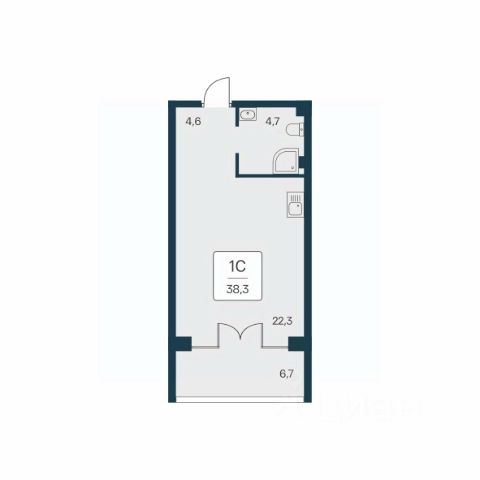 Просторная комната — 24 м², которая может служить спальней или гостиной;Совмещённый санузел — 3,9 м²;