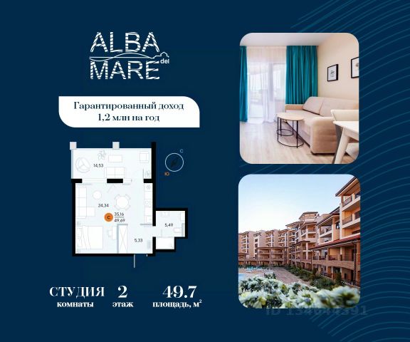 Продаются апартаменты в построенном комплексе. Срок сдачи 4 квартал 2024 года. Альба Дель Маре это комплекс апартаментов бизнес-класса с развитой инфраструктурой. Уютные здания переменной этажности строятся в 5 минутах ходьбы (385 метров) от одного из лучших пляжей Евпатории "Супер Аква Бич". Широкая береговая линия, места для активного отдыха и зоны релакса позволят насладиться отдыхом на любой вкус. Архитектурное решение комплекса создает истинное ощущение Средиземноморья и присутствия на дорогом курорте: скатные черепичные крыши, козырьки и навесы-перголы, арочные завершения проемов, цветовая палитра отделки и фасадов, где используются оттенки желтого, охры, терракоты и бежевого. Переменная этажность здания формирует камерность проекта, создавая прекрасные видовые характеристики для каждого апартамента. Просторные террасы с видом на море, патио с собственным выходом к бассейну на первых этажах комплекса, детская и спортивная площадки, ландшафтный дизайн здесь все создано для роскошного отдыха и расслабления. Территория комплекса апартаментов закрыта и находится под круглосуточным видеонаблюдением, что позволит резидентам и гостям чувствовать безопасность проживания. Концепция комплекса: комфорт проживания с первых дней заселения. Реализация апартаментов осуществляется с полной отделкой под ключ. Собственники апартаментов имеют возможность поручить управление недвижимостью профессиональному оператору, что позволит получать стабильный доход. Автономная газовая котельная позволит не зависеть от внешних отключений отопления., парковочные места на закрытой территории комплекса обеспечат безопасность вашему автомобилю, система центрального кондиционирования создаст комфортную температуру в каждом номере. Жилой комплекс реализуется в соответствии с 214 ФЗ. Продам квартиру-студию 50 м2 (квадратных метров) в республике Крым.