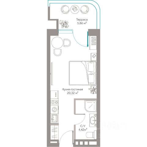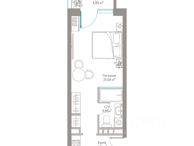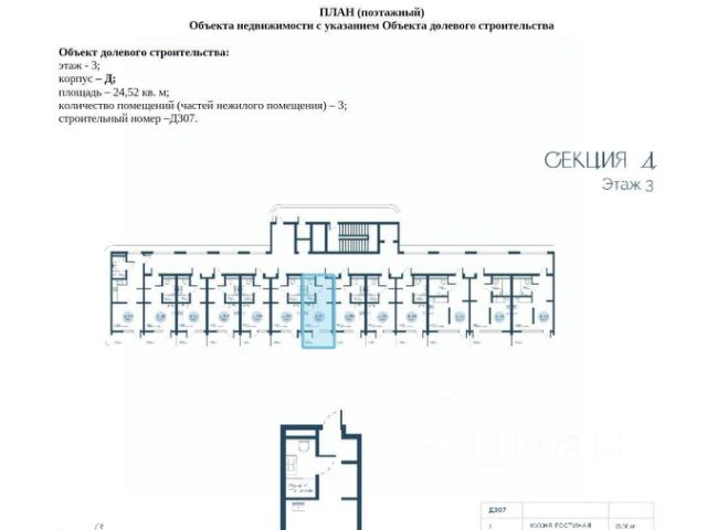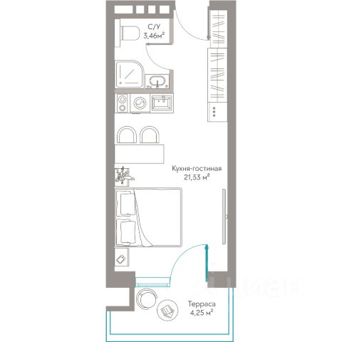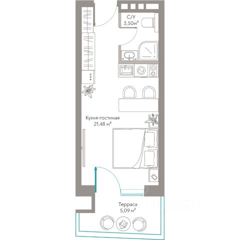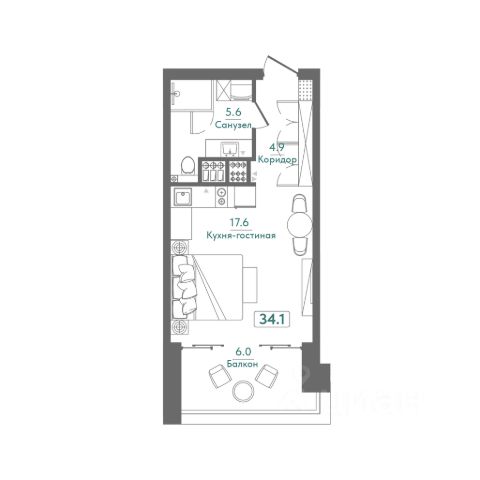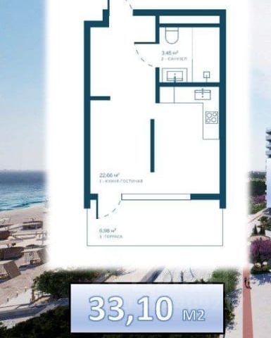 Студия площадью 24,7 кв.м. располагается на 3 этаже 12-этажного корпуса В, с прямым видом на море.