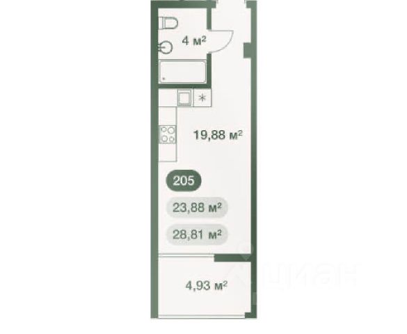 Апартаменты общей площадью 46.13 м², которые находятся на 4 этаже 9 этажного дома, кухня 6.19м2, жилая 26.19, санузел совмещённый.