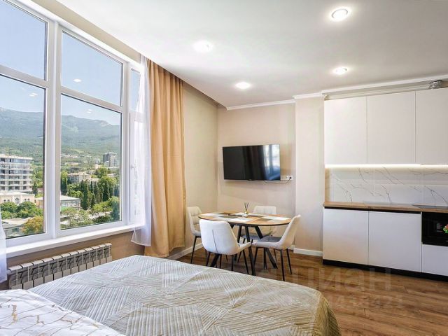 Просторная студия, квартира расположена на 5 этаже, окна выходят на могущественные Крымские горы. Апартамент с одним из самых живописных видов в Ялте, в шаговой доступности у вас и супермаркеты, и парки, всего через 3 остановки вы окажитесь в центре города.