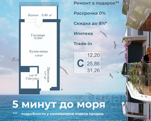 Продаются апартаменты в построенном комплексе. Срок сдачи 4 квартал 2024 года. Альба Дель Маре это комплекс апартаментов бизнес-класса с развитой инфраструктурой. Уютные здания переменной этажности строятся в 5 минутах ходьбы (385 метров) от одного из лучших пляжей Евпатории "Супер Аква Бич". Широкая береговая линия, места для активного отдыха и зоны релакса позволят насладиться отдыхом на любой вкус. Архитектурное решение комплекса создает истинное ощущение Средиземноморья и присутствия на дорогом курорте: скатные черепичные крыши, козырьки и навесы-перголы, арочные завершения проемов, цветовая палитра отделки и фасадов, где используются оттенки желтого, охры, терракоты и бежевого. Переменная этажность здания формирует камерность проекта, создавая прекрасные видовые характеристики для каждого апартамента. Просторные террасы с видом на море, патио с собственным выходом к бассейну на первых этажах комплекса, детская и спортивная площадки, ландшафтный дизайн здесь все создано для роскошного отдыха и расслабления. Территория комплекса апартаментов закрыта и находится под круглосуточным видеонаблюдением, что позволит резидентам и гостям чувствовать безопасность проживания. Концепция комплекса: комфорт проживания с первых дней заселения. Реализация апартаментов осуществляется с полной отделкой под ключ. Собственники апартаментов имеют возможность поручить управление недвижимостью профессиональному оператору, что позволит получать стабильный доход. Автономная газовая котельная позволит не зависеть от внешних отключений отопления., парковочные места на закрытой территории комплекса обеспечат безопасность вашему автомобилю, система центрального кондиционирования создаст комфортную температуру в каждом номере. Жилой комплекс реализуется в соответствии с 214 ФЗ.