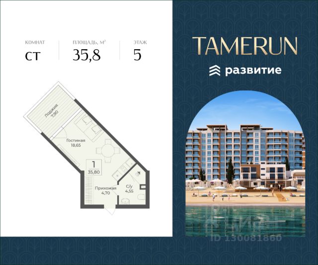 В продаже s комнатный апартамент площадью 32.40 кв. м, без отделки. Апартамент расположен в апарт-комплексе Tamerun от ГК "Развитие". Tamerun - морская резиденция на Западном берегу Крыма, между городами Евпатория и Саки. Апарт-комплекс расположен на первой береговой линии в живописной бухте Каламийского залива, между Черным морем и розовым озером Сасык. В рамках реализации проекта предусмотрено 1213 доходных апартаментов с первоклассным отельным и санаторно-курортным сервисом. Клубная инфраструктура, историческая локация, интерьеры от ведущих дизайнеров - все это и многое другое ждет вас в солнечной резиденции Tamerun. Расположение Пешком: - 15 мин. до Ж/Д станции "Техникум"; - 20 мин. до Ж/Д станции "Прибрежная"; - 25 мин. до Пирса у озера Сасык-Сиваш. На автомобиле: - 5 мин. до Симферопольского шоссе; - 10 мин. до города Саки; - 20 мин. до Евпатории; - 45 мин. до аэропорта имени И. К. Айвазовского. Благоустройство - собственный клубный пляж; - развлекательный центр; - 2 открытых и 1 закрытый бассейн; - медицинский SPA-комплекс; - фитнес-центр с залами для йоги и гимнастики; - площадки для тенниса, футбола и волейбола; - амфитеатр на свежем морском воздухе; - лаунж-зона и прогулочные дорожки; - детский клуб с кинотеатром; - батуты, лабиринты и скалодромы для подростков; - конференц-зал на 50 человек и переговорные кабинеты; - более 100 растений в приватном дворе; - круглосуточный консьерж-сервис; - подземный паркинг на 188 машино-мест с автомойкой; - наземная гостевая парковка на 259 машино-мест; - летнее кафе, 3 ресторана и супермаркет прямо в доме. Окружение - Сасыкский заказник, крупнейшее в Крыму соленое розовое озеро Сасык-Сиваш, песчаные пляжи протяженностью в 150 метров; - главная мечеть Евпатории Джума-Джами, Собор Николая Чудотворца, Комплекс Караимских кенас; - множество другой повседневной инфраструктуры в ближайшем городе Саки.