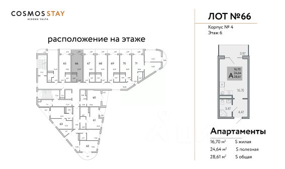 COSMOS STAY HIDDEN YALTA - это комплекс апартаментов из 5 корпусов для отдыха с собственной развитой инфраструктурой. Находится в Ялте у подножья горы Могаби на южном берегу Крыма, вблизи с живописным горно-лесным заповедником. Из апартаментов комплекса открываются завораживающие виды на горные вершины и Чёрное море. В шаговой доступности могабинские озера. Находится на подножии Ай-Петри, что позволяет комфортно добраться до горных склонов. До центра Ялты 10 минут на машине, как и до моря. Концепция апарт-комплекса предполагает круглогодичный комфортный отдых в формате retreat, с заботой о ментальном и физическом здоровье. Всё для Вашего восстановления и перезагрузки, для размеренной и комфортной жизни. Целебный морской воздух и благодатный климат. В комплексе создана атмосфера респектабельной среды для жизни: - собственная инфраструктура; - свой зеленый двор; - безопасность; - детские пространства; - собственная инфраструктура; - свой зеленый двор; - безопасность; - детские пространства; - лаунж-зоны; - будет присвоен статус 3 звезды и работать отельный оператор; - пространства для медитаций и занятий йогой; - ресторан; - индивидуальные келлеры для габаритного инвентаря; - всесезонный бассейн; Консьерж-сервис полного цикла обслуживания с опцией управления недвижимостью - разрешит любой возникающий вопрос. Строительство ведется при проектном финансировании СБЕРБАНКА, ФЗ-214. Продажа через эскроу-счет без комиссий. Завершение строительства - 3 квартал 2026 года Передача ключей до 31.12.2026 Ремонт и оснащение апартаментов: декабрь 2026-апрель 2027 Запуск апарт-отеля в управление - июнь 2027