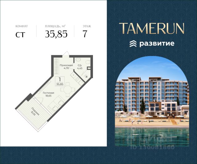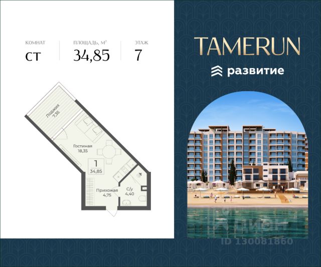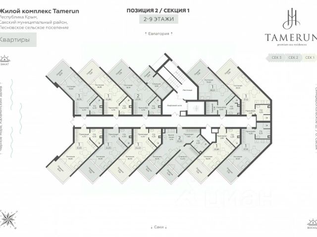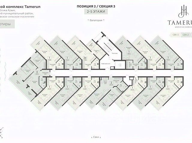 В продаже s комнатный апартамент площадью 34.40 кв. м, без отделки. Апартамент расположен в апарт-комплексе Tamerun от ГК "Развитие". Tamerun - морская резиденция на Западном берегу Крыма, между городами Евпатория и Саки. Апарт-комплекс расположен на первой береговой линии в живописной бухте Каламийского залива, между Черным морем и розовым озером Сасык. В рамках реализации проекта предусмотрено 1213 доходных апартаментов с первоклассным отельным и санаторно-курортным сервисом. Клубная инфраструктура, историческая локация, интерьеры от ведущих дизайнеров - все это и многое другое ждет вас в солнечной резиденции Tamerun. Расположение Пешком: - 15 мин. до Ж/Д станции "Техникум"; - 20 мин. до Ж/Д станции "Прибрежная"; - 25 мин. до Пирса у озера Сасык-Сиваш. На автомобиле: - 5 мин. до Симферопольского шоссе; - 10 мин. до города Саки; - 20 мин. до Евпатории; - 45 мин. до аэропорта имени И. К. Айвазовского. Благоустройство - собственный клубный пляж; - развлекательный центр; - 2 открытых и 1 закрытый бассейн; - медицинский SPA-комплекс; - фитнес-центр с залами для йоги и гимнастики; - площадки для тенниса, футбола и волейбола; - амфитеатр на свежем морском воздухе; - лаунж-зона и прогулочные дорожки; - детский клуб с кинотеатром; - батуты, лабиринты и скалодромы для подростков; - конференц-зал на 50 человек и переговорные кабинеты; - более 100 растений в приватном дворе; - круглосуточный консьерж-сервис; - подземный паркинг на 188 машино-мест с автомойкой; - наземная гостевая парковка на 259 машино-мест; - летнее кафе, 3 ресторана и супермаркет прямо в доме. Окружение - Сасыкский заказник, крупнейшее в Крыму соленое розовое озеро Сасык-Сиваш, песчаные пляжи протяженностью в 150 метров; - главная мечеть Евпатории Джума-Джами, Собор Николая Чудотворца, Комплекс Караимских кенас; - множество другой повседневной инфраструктуры в ближайшем городе Саки.