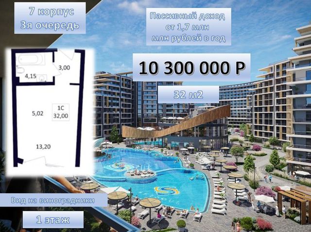 По переуступке продается видовая апартамент-студия в строящемся туристическо-рекреационном комплексе бизнес класса SkySoul Resort. Общая площадь 27,84 м2 Жилая площадь 20,54 m2 Первая береговая линия, 30 метров от берега с собственным пляжем, приватной территорией, круглосуточной охраной. 6 корпус, вид на гору Кара-Даг. Высокие потолки, панорамные окна, предчистовая отделка white-box. Отдыхаете в удобное вам время сами, остальное время сдаете в аренду через управляющую компанию. Стабильный пассивный доход, расчетная окупаемость 7-8 лет. Подобных вариантов у застройщика не осталось. Преимущества: - открытый бассейны, 2 больших открытых бассейна площадью 1250 м² - Всесезонные бассейны Крытый бассейн в SPA комплексе 200м² - 14.5 га Общая площадь. Огромная закрытая и охраняемая территория с развитой благоустроенной инфраструктуры - SPA комплекс, Амфитеатр, Тренажерные залы, Теннисные корты, Фитнес студии, Игровые пространства для детей - Магазины в шаговой доступности. Торговый центр и зона бутиков - Это целый ряд ресторанов и баров на любой вкус для самых изысканных гурманов МЫ ГАРАНТИРУЕМ ФИНАНСОВУЮ БЕЗОПАСНОСТЬ ДЛЯ НАШИХ КЛИЕНТОВ. Полное юридическое сопровождение сделки. Высокий шанс одобрения ипотеки. Звоните, с удовольствием ответим на ваши вопросы! Код пользователя: 168937 Номер в базе: 4382589