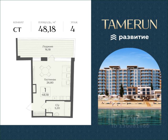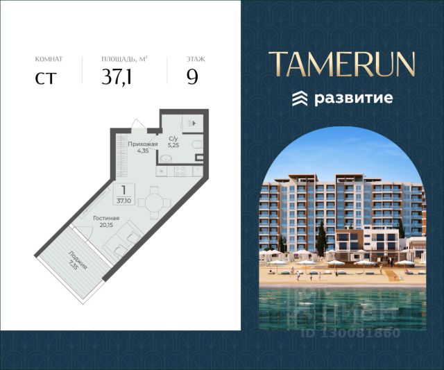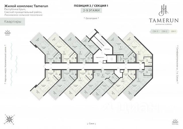 В продаже s комнатный апартамент площадью 35.85 кв. м, без отделки. Апартамент расположен в апарт-комплексе Tamerun от ГК "Развитие". Tamerun - морская резиденция на Западном берегу Крыма, между городами Евпатория и Саки. Апарт-комплекс расположен на первой береговой линии в живописной бухте Каламийского залива, между Черным морем и розовым озером Сасык. В рамках реализации проекта предусмотрено 1213 доходных апартаментов с первоклассным отельным и санаторно-курортным сервисом. Клубная инфраструктура, историческая локация, интерьеры от ведущих дизайнеров - все это и многое другое ждет вас в солнечной резиденции Tamerun. Расположение Пешком: - 15 мин. до Ж/Д станции "Техникум"; - 20 мин. до Ж/Д станции "Прибрежная"; - 25 мин. до Пирса у озера Сасык-Сиваш. На автомобиле: - 5 мин. до Симферопольского шоссе; - 10 мин. до города Саки; - 20 мин. до Евпатории; - 45 мин. до аэропорта имени И. К. Айвазовского. Благоустройство - собственный клубный пляж; - развлекательный центр; - 2 открытых и 1 закрытый бассейн; - медицинский SPA-комплекс; - фитнес-центр с залами для йоги и гимнастики; - площадки для тенниса, футбола и волейбола; - амфитеатр на свежем морском воздухе; - лаунж-зона и прогулочные дорожки; - детский клуб с кинотеатром; - батуты, лабиринты и скалодромы для подростков; - конференц-зал на 50 человек и переговорные кабинеты; - более 100 растений в приватном дворе; - круглосуточный консьерж-сервис; - подземный паркинг на 188 машино-мест с автомойкой; - наземная гостевая парковка на 259 машино-мест; - летнее кафе, 3 ресторана и супермаркет прямо в доме. Окружение - Сасыкский заказник, крупнейшее в Крыму соленое розовое озеро Сасык-Сиваш, песчаные пляжи протяженностью в 150 метров; - главная мечеть Евпатории Джума-Джами, Собор Николая Чудотворца, Комплекс Караимских кенас; - множество другой повседневной инфраструктуры в ближайшем городе Саки.