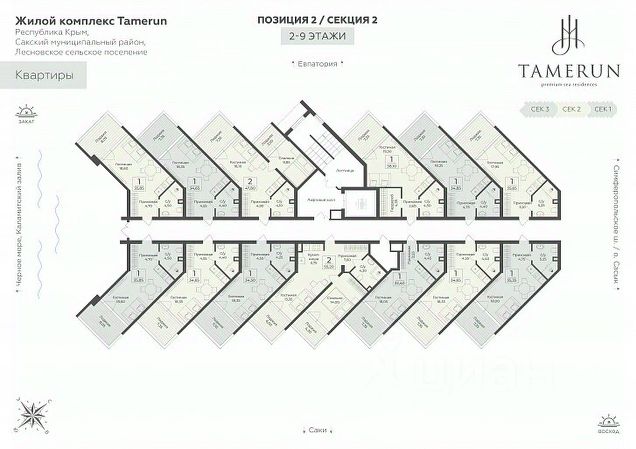 В продаже s комнатный апартамент площадью 36.05 кв. м, без отделки. Апартамент расположен в апарт-комплексе Tamerun от ГК "Развитие". Tamerun - морская резиденция на Западном берегу Крыма, между городами Евпатория и Саки. Апарт-комплекс расположен на первой береговой линии в живописной бухте Каламийского залива, между Черным морем и розовым озером Сасык. В рамках реализации проекта предусмотрено 1213 доходных апартаментов с первоклассным отельным и санаторно-курортным сервисом. Клубная инфраструктура, историческая локация, интерьеры от ведущих дизайнеров - все это и многое другое ждет вас в солнечной резиденции Tamerun. Расположение Пешком: - 15 мин. до Ж/Д станции "Техникум"; - 20 мин. до Ж/Д станции "Прибрежная"; - 25 мин. до Пирса у озера Сасык-Сиваш. На автомобиле: - 5 мин. до Симферопольского шоссе; - 10 мин. до города Саки; - 20 мин. до Евпатории; - 45 мин. до аэропорта имени И. К. Айвазовского. Благоустройство - собственный клубный пляж; - развлекательный центр; - 2 открытых и 1 закрытый бассейн; - медицинский SPA-комплекс; - фитнес-центр с залами для йоги и гимнастики; - площадки для тенниса, футбола и волейбола; - амфитеатр на свежем морском воздухе; - лаунж-зона и прогулочные дорожки; - детский клуб с кинотеатром; - батуты, лабиринты и скалодромы для подростков; - конференц-зал на 50 человек и переговорные кабинеты; - более 100 растений в приватном дворе; - круглосуточный консьерж-сервис; - подземный паркинг на 188 машино-мест с автомойкой; - наземная гостевая парковка на 259 машино-мест; - летнее кафе, 3 ресторана и супермаркет прямо в доме. Окружение - Сасыкский заказник, крупнейшее в Крыму соленое розовое озеро Сасык-Сиваш, песчаные пляжи протяженностью в 150 метров; - главная мечеть Евпатории Джума-Джами, Собор Николая Чудотворца, Комплекс Караимских кенас; - множество другой повседневной инфраструктуры в ближайшем городе Саки.