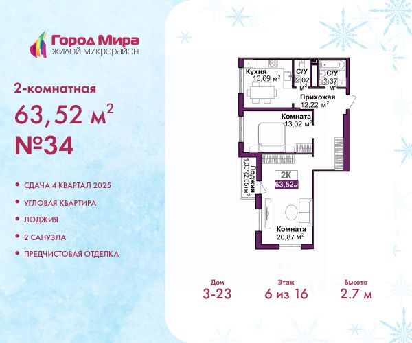 1-комн. квартира от застройщика с предчистовой отделкой в ЖМ "Город Мира" на 11 этаже. Общая площадь: 44.37 кв.м., жилая: 19.97 кв.м., площадь просторной кухни-столовой: 11.02 кв.м. Квартира угловая, идеально подойдет любителям тишины и панорамных видов. В квартире один балкон, один совмещенный санузел. Высота потолков 2.7 м. "Город Мира" это масштабный жилой комплекс, созданный для тех, кто ценит комфорт, безопасность и гармонию с природой. Здесь продумана каждая деталь от удобной инфраструктуры до эргономичных планировок квартир. Главные преимущества: Удачное расположение зеленый район с благоприятным микроклиматом Продуманное зонирование жилые кварталы, зоны отдыха и коммерческие объекты Комфорт-класс высокое качество строительства и современные инженерные решения Инфраструктура Города Мира: Образование и досуг: 2 детских сада (по 260 мест каждый) Планируется строительство общеобразовательной школы Детские и спортивные площадки в каждом дворе Беседки для отдыха, зоны для выгула собак Торговля и сервис: Магазины, аптеки, медицинские центры Фитнес-клубы, салоны красоты Детские развивающие центры Парковки: Гостевые парковки Наземные и подземные паркинги Благоустройство территории: Ландшафтный дизайн с зонами отдыха Современные детские площадки Стильные холлы с дизайнерской отделкой Система видеонаблюдения для безопасности. Почему именно 23-й дом? Комфорт и планировки: • Просторные квартиры с двумя санузлами и гардеробными • Увеличенная площадь остекления — максимум света и воздуха • Индивидуальное отопление — комфорт в любое время года Эстетика и стиль: • Дизайнерские входные группы — стиль начинается с порога • Архитектурная подсветка фасада — дом, которым хочется гордиться • Панорамные виды на город и сосновый бор рядом Инфраструктура и удобство: • Консьерж-сервис — дополнительный уровень сервиса и безопасности • Колясочные • Выполнена стяжка пола и штукатурка стен • Центральная локация внутри микрорайона — тишина и доступность Жизнь внутри дома: • Двухэтажный стилобат с коммерцией: магазины, кафе, офисы, студии и даже школа танцев • Современный двор: детский игровой комплекс, зоны отдыха для взрослых, зарядка для электромобилей, зона wi-fi на улице Возможно приобретение в ипотеку по выгодным условиям: • ставка — от 6% годовых • первоначальный взнос — от 20% • срок — до 30 лет • можно использовать материнский капитал даже на первый взнос. Также доступны военная и IT-ипотека Рассрочка от застройщика: • первый взнос от 30%, • равномерные платежи до окончания строительства. Квартира находится в корпусе 3_23. Дом монолитный, одноподъездный, высотой 16 этажей. В подъезде 1 пассажирский и 1 грузовой лифт. Окончание строительства - 4 квартал 2025 года. Оформление сделки по договору долевого участия. #ZSSgV4