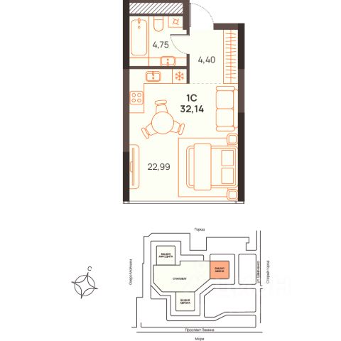 "Западный Проспект 82" — альянс жилых домов бизнес-класса в центре Евпатории, формирующий новое качество жизни у моря. Проект объединяет преимущества современной городской среды и курортного образа жизни: здесь можно работать, развиваться и отдыхать, не теряя привычного уровня комфорта. Комплекс представляет собой архитектурный ансамбль из трёх 23-этажных башен с панорамным остеклением, объединённых стилобатом с деловой, торговой и развлекательной инфраструктурой. Продуманная концепция формирует полноценную экосистему жизни, где все необходимые сценарии — от работы до отдыха — доступны внутри проекта. В основе — идея жизни без компромиссов: сочетание приватности, сервиса и насыщенной городской среды в непосредственной близости к морю. Ключевые преимущества проекта: уникальное расположение в историческом центре Евпатории — в 10 минутах от побережья Чёрного моря;современная архитектура с панорамным остеклением и выразительной подсветкой фасадов;более 20 типов планировок — от функциональных студий до просторных квартир с террасами и видовыми характеристиками;развитая внутренняя инфраструктура: торгово-развлекательный центр, рестораны, винотека, коворкинг и сервисные пространства;собственный центр культурного развития для детей с концертным залом;масштабная спортивная инфраструктура: тренажёрный зал, зоны фитнеса, воркаут-пространства, корт, йога и пилатес;благоустроенные дворы с ландшафтным дизайном, прогулочными зонами и общественными пространствами;более 3000 м² приватной территории на эксплуатируемой кровле с зонами для отдыха, спортивной и детской инфраструктурой;двухуровневый подземный паркинг с детейлинг сервисом и зарядками для электромобилей;широкий спектр сервисов уровня 5: консьерж-сервис 24/7, рум-сервис, клининг и техническое обслуживание, валет-паркинг, доставка и цифровые сервисы управления;благоустроенный пляж для резидентов комплекса. "Западный Проспект 82" создаёт среду, в которой высокий уровень жизни сохраняется независимо от локации — пространство, где каждый день ощущается как баланс работы, отдыха и личного комфорта. Запишитесь на персональную консультацию в Ателье недвижимости "Западный Проспект 82", чтобы подобрать квартиру, соответствующую вашему ритму жизни и ожиданиям от комфортного проживания у моря. Квартира-студия на проспекте Ленина в городе Евпатория.