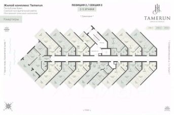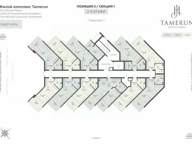 "Tamerun" - морская резиденция на Западном берегу Крыма, между городами Евпатория и Саки. Резиденция "Tamerun" представляет собой современный комплекс из четырёх корпусов высотой 9 и 12 этажей, гармонично вписанных в живописный ландшафт. Интерьеры выполнены в изысканном элегантном стиле с применением премиальных материалов — натурального мрамора, ценных пород дерева и высококачественной кожи. Просторные помещения наполнены естественным светом благодаря большим панорамным окнам, открывающим завораживающие виды на Черное море. Атмосфера резиденции пропитана уютом и гармонией, создавая идеальные условия для комфортной жизни и отдыха. Рядом с "Tamerun" находится Сасыкский заказник и самое крупное в Крыму солёное розовое озеро Сасык-Сиваш. На территории резиденции находится открытый бассейн с подогревом, окружённый шезлонгами и зоной отдыха, где можно наслаждаться теплыми лучами солнца и свежим морским бризом. Для любителей активного отдыха предусмотрен теннисный корт и фитнес-зал, оборудованный новейшими тренажёрами. В солнечной резиденции есть всё для жизни и интересного отдыха: собственный песчаный пляж и теннисный корт, бассейны с морской водой, рестораны и летнее кафе, зона СПА и фитнес-центр, общественно-деловые пространства и подземный паркинг. Профессиональная сервисная компания с международным опытом возьмёт на себя все операционные вопросы по управлению и эксплуатации, обеспечивая 5-звёздочный уровень обслуживания.