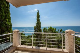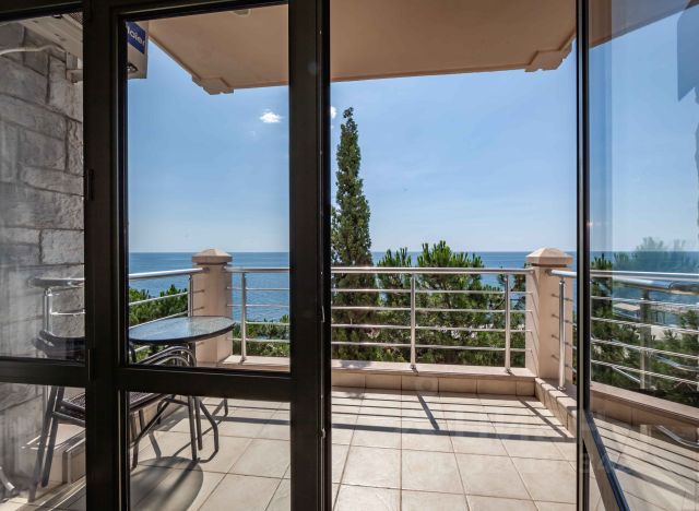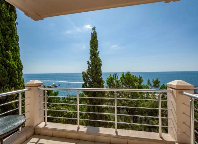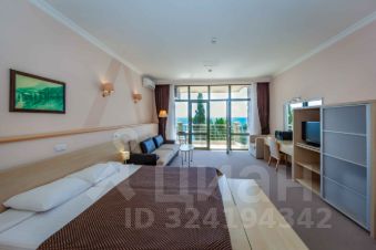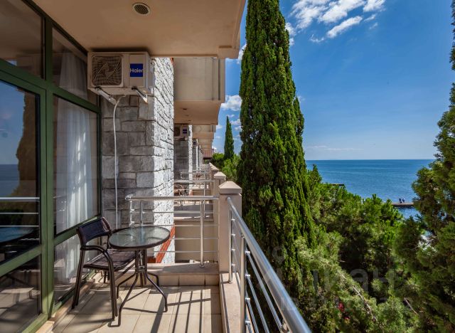 Установлена видеокамера.Планировка студии удобная и правильной формы. Широкий балкон, на котором можно наслаждаться видом на море, установить шезлонги и загорать.