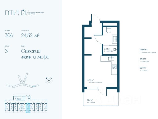 СКК "Птица" — санаторно-курортный комплекс премиум-класса на первой береговой линии Черного моря Локация Комплекс располагается в курортном поселке Саки на западном берегу Крыма 35 минут от аэропорта Симферополя40 минут до трассы "Таврида"47 минут до Ж/Д вокзала3 часа от Крымского моста30 минут до ЕвпаторииСаки курорт с 2500 летней историейРядом с природными и историческими достопримечательностями: мыс Фиолент, мыс Тарханкут, Оленёвка, Балаклавская бухта9 минут до розового озера Сасык-Сиваш4 минут до лечебного Сакского озера О комплексе Общая площадь комплекса: 11 га До оборудованного пляжа: 50 метров Номерной фонд: 1238 лотов Площади апартаментов: от 25 м² до 360 м² Инфраструктура Собственный оборудованный пляж 195 х 200 метровРесторан с панорамным видом на мореКруглогодичный бассейн 700 м²SPA-комплекс площадью 1960 м² с саунами и хамамомСовременный санаторий, площадью 33 387 м²Спортивный комплекс с высококлассным оборудованиемЭксплуатируемая кровляFood-зоны с разнообразными сценариямиДетские развивающие пространстваКоммерческие помещенияКомнаты для сна на мореОранжерея с птицами Санаторно-курортный комплекс Птица стал финалистом премии Рекорды Рынка Недвижимости в номинации "Премьера года Премиум-класса 1"