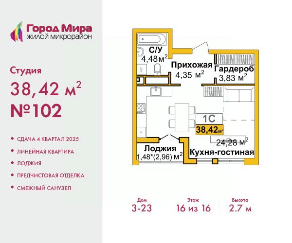 Торопитесь оформить бронирование по акционной цене! Предложение ограничено! Стоимость квартиры указана со скидкой, ваша экономия составит 537,950 RUB. Звоните, наши менеджеры вам все расскажут! 1-комн. квартира-студия с предчистовой отделкой в ЖМ "Город Мира" на 13 этаже. Общая площадь: 38.42 кв.м., площадь гостиной 24.28 кв.м., из которых 5 кв.м. выделено под кухонную зону. Все окна выходят на одну сторону. В квартире одна лоджия, один совмещенный санузел. Высота потолков 2.7 м. "Город Мира" это масштабный жилой комплекс, созданный для тех, кто ценит комфорт, безопасность и гармонию с природой. Здесь продумана каждая деталь от удобной инфраструктуры до эргономичных планировок квартир. Главные преимущества: Удачное расположение зеленый район с благоприятным микроклиматом Продуманное зонирование жилые кварталы, зоны отдыха и коммерческие объекты Комфорт-класс высокое качество строительства и современные инженерные решения Инфраструктура Города Мира: Образование и досуг: 2 детских сада (по 260 мест каждый) Планируется строительство общеобразовательной школы Детские и спортивные площадки в каждом дворе Беседки для отдыха, зоны для выгула собак Торговля и сервис: Магазины, аптеки, медицинские центры Фитнес-клубы, салоны красоты Детские развивающие центры Парковки: Гостевые парковки Наземные и подземные паркинги Благоустройство территории: Ландшафтный дизайн с зонами отдыха Современные детские площадки Стильные холлы с дизайнерской отделкой Система видеонаблюдения для безопасности. Почему именно 23-й дом? Комфорт и планировки: • Просторные квартиры с двумя санузлами и гардеробными • Увеличенная площадь остекления — максимум света и воздуха • Индивидуальное отопление — комфорт в любое время года Эстетика и стиль: • Дизайнерские входные группы — стиль начинается с порога • Архитектурная подсветка фасада — дом, которым хочется гордиться • Панорамные виды на город и сосновый бор рядом Инфраструктура и удобство: • Консьерж-сервис — дополнительный уровень сервиса и безопасности • Колясочные • Выполнена стяжка пола и штукатурка стен • Центральная локация внутри микрорайона — тишина и доступность Жизнь внутри дома: • Двухэтажный стилобат с коммерцией: магазины, кафе, офисы, студии и даже школа танцев • Современный двор: детский игровой комплекс, зоны отдыха для взрослых, зарядка для электромобилей, зона wi-fi на улице Возможно приобретение в ипотеку по выгодным условиям: • ставка — от 6% годовых • первоначальный взнос — от 20% • срок — до 30 лет • можно использовать материнский капитал даже на первый взнос. Также доступны военная и IT-ипотека Рассрочка от застройщика: • первый взнос от 30%, • равномерные платежи до окончания строительства. Квартира находится в корпусе 3_23. Дом монолитный, одноподъездный, высотой 16 этажей. В подъезде 1 пассажирский и 1 грузовой лифт. Окончание строительства - 4 квартал 2025 года. Оформление сделки по договору долевого участия. #z66WzZ