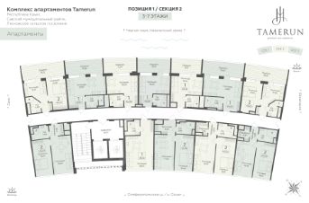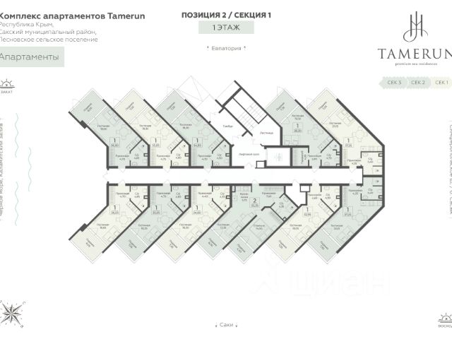 "Tamerun" - морская резиденция на Западном берегу Крыма, между городами Евпатория и Саки. Резиденция "Tamerun" представляет собой современный комплекс из четырёх корпусов высотой 9 и 12 этажей, гармонично вписанных в живописный ландшафт. Интерьеры выполнены в изысканном элегантном стиле с применением премиальных материалов — натурального мрамора, ценных пород дерева и высококачественной кожи. Просторные помещения наполнены естественным светом благодаря большим панорамным окнам, открывающим завораживающие виды на Черное море. Атмосфера резиденции пропитана уютом и гармонией, создавая идеальные условия для комфортной жизни и отдыха. Рядом с "Tamerun" находится Сасыкский заказник и самое крупное в Крыму солёное розовое озеро Сасык-Сиваш. На территории резиденции находится открытый бассейн с подогревом, окружённый шезлонгами и зоной отдыха, где можно наслаждаться теплыми лучами солнца и свежим морским бризом. Для любителей активного отдыха предусмотрен теннисный корт и фитнес-зал, оборудованный новейшими тренажёрами. В солнечной резиденции есть всё для жизни и интересного отдыха: собственный песчаный пляж и теннисный корт, бассейны с морской водой, рестораны и летнее кафе, зона СПА и фитнес-центр, общественно-деловые пространства и подземный паркинг. Профессиональная сервисная компания с международным опытом возьмёт на себя все операционные вопросы по управлению и эксплуатации, обеспечивая 5-звёздочный уровень обслуживания.