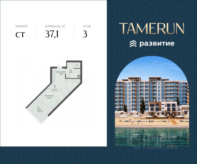 На первой береговой линии Черного моря продается апартамент площадью 42.74 кв. м без отделки. Апартамент находится в апарт-комплексе премиум-класса Tamerun Grand Mirmax 5*, между городами Евпатория и Саки от федерального застройщика ГК "Развитие".