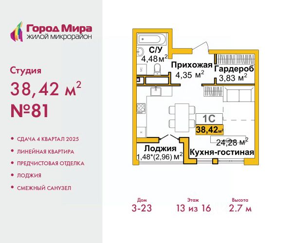 Однокомнатная квартира-студия от застройщика с предчистовой отделкой в ЖМ "Город Мира" на 13 этаже. Общая площадь: 38.42 кв.м., площадь гостиной 24.28 кв.м., из которых 5 кв.м. выделено под кухонную зону. Все окна выходят на одну сторону. В квартире одна лоджия, один совмещенный санузел. Высота потолков 2.7 м. "Город Мира" это масштабный жилой комплекс, созданный для тех, кто ценит комфорт, безопасность и гармонию с природой. Здесь продумана каждая деталь от удобной инфраструктуры до эргономичных планировок квартир. Главные преимущества: Удачное расположение зеленый район с благоприятным микроклиматом Продуманное зонирование жилые кварталы, зоны отдыха и коммерческие объекты Комфорт-класс высокое качество строительства и современные инженерные решения Инфраструктура Города Мира: Образование и досуг: 2 детских сада (по 260 мест каждый) Планируется строительство общеобразовательной школы Детские и спортивные площадки в каждом дворе Беседки для отдыха, зоны для выгула собак Торговля и сервис: Магазины, аптеки, медицинские центры Фитнес-клубы, салоны красоты Детские развивающие центры Парковки: Гостевые парковки Наземные и подземные паркинги Благоустройство территории: Ландшафтный дизайн с зонами отдыха Современные детские площадки Стильные холлы с дизайнерской отделкой Система видеонаблюдения для безопасности. Почему именно 23-й дом? Комфорт и планировки: • Просторные квартиры с двумя санузлами и гардеробными • Увеличенная площадь остекления — максимум света и воздуха • Индивидуальное отопление — комфорт в любое время года Эстетика и стиль: • Дизайнерские входные группы — стиль начинается с порога • Архитектурная подсветка фасада — дом, которым хочется гордиться • Панорамные виды на город и сосновый бор рядом Инфраструктура и удобство: • Консьерж-сервис — дополнительный уровень сервиса и безопасности • Колясочные • Выполнена стяжка пола и штукатурка стен • Центральная локация внутри микрорайона — тишина и доступность Жизнь внутри дома: • Двухэтажный стилобат с коммерцией: магазины, кафе, офисы, студии и даже школа танцев • Современный двор: детский игровой комплекс, зоны отдыха для взрослых, зарядка для электромобилей, зона wi-fi на улице Возможно приобретение в ипотеку по выгодным условиям: • ставка — от 6% годовых • первоначальный взнос — от 20% • срок — до 30 лет • можно использовать материнский капитал даже на первый взнос. Также доступны военная и IT-ипотека Рассрочка от застройщика: • первый взнос от 30%, • равномерные платежи до окончания строительства. Квартира находится в корпусе 3_23. Дом монолитный, одноподъездный, высотой 16 этажей. В подъезде 1 пассажирский и 1 грузовой лифт. Окончание строительства - 4 квартал 2025 года. Оформление сделки по договору долевого участия. #zmmwZZ