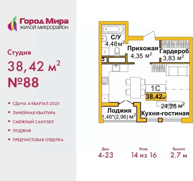 1-комн. квартира-студия от застройщика с предчистовой отделкой в ЖМ "Город Мира" на 12 этаже. Общая площадь: 38.42 кв.м., площадь гостиной 24.28 кв.м., из которых 5 кв.м. выделено под кухонную зону. Все окна выходят на одну сторону. В квартире одна лоджия, один совмещенный санузел. Высота потолков 2.7 м. "Город Мира" это масштабный жилой комплекс, созданный для тех, кто ценит комфорт, безопасность и гармонию с природой. Здесь продумана каждая деталь от удобной инфраструктуры до эргономичных планировок квартир. Главные преимущества: Удачное расположение зеленый район с благоприятным микроклиматом Продуманное зонирование жилые кварталы, зоны отдыха и коммерческие объекты Комфорт-класс высокое качество строительства и современные инженерные решения Инфраструктура Города Мира: Образование и досуг: 2 детских сада (по 260 мест каждый) Планируется строительство общеобразовательной школы Детские и спортивные площадки в каждом дворе Беседки для отдыха, зоны для выгула собак Торговля и сервис: Магазины, аптеки, медицинские центры Фитнес-клубы, салоны красоты Детские развивающие центры Парковки: Гостевые парковки Наземные и подземные паркинги Благоустройство территории: Ландшафтный дизайн с зонами отдыха Современные детские площадки Стильные холлы с дизайнерской отделкой Система видеонаблюдения для безопасности. Почему именно 23-й дом? Комфорт и планировки: • Просторные квартиры с двумя санузлами и гардеробными • Увеличенная площадь остекления — максимум света и воздуха • Индивидуальное отопление — комфорт в любое время года Эстетика и стиль: • Дизайнерские входные группы — стиль начинается с порога • Архитектурная подсветка фасада — дом, которым хочется гордиться • Панорамные виды на город и сосновый бор рядом Инфраструктура и удобство: • Консьерж-сервис — дополнительный уровень сервиса и безопасности • Колясочные • Выполнена стяжка пола и штукатурка стен • Центральная локация внутри микрорайона — тишина и доступность Жизнь внутри дома: • Двухэтажный стилобат с коммерцией: магазины, кафе, офисы, студии и даже школа танцев • Современный двор: детский игровой комплекс, зоны отдыха для взрослых, зарядка для электромобилей, зона wi-fi на улице Возможно приобретение в ипотеку по выгодным условиям: • ставка — от 6% годовых • первоначальный взнос — от 20% • срок — до 30 лет • можно использовать материнский капитал даже на первый взнос. Также доступны военная и IT-ипотека Рассрочка от застройщика: • первый взнос от 30%, • равномерные платежи до окончания строительства. Квартира находится в корпусе 3_23. Дом монолитный, одноподъездный, высотой 16 этажей. В подъезде 1 пассажирский и 1 грузовой лифт. Окончание строительства - 4 квартал 2025 года. Оформление сделки по договору долевого участия. #Z6mwZl