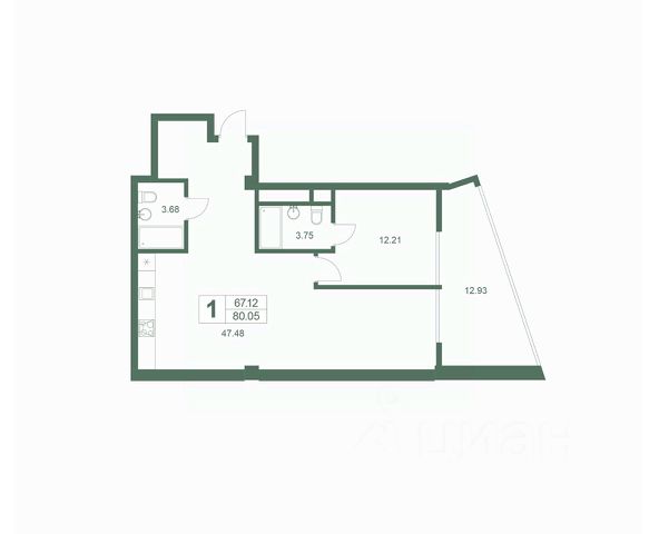 Сам апартамент включает в себя изолированную спальню с балконом, площадью 14 кв. м., наблюдать закаты и рассветы прям из своей спальни, не это ли сказка? Кухня-гостиная 18кв. м., Санузел и просторная прихожая, в которой можно выделить место под гардеробную.