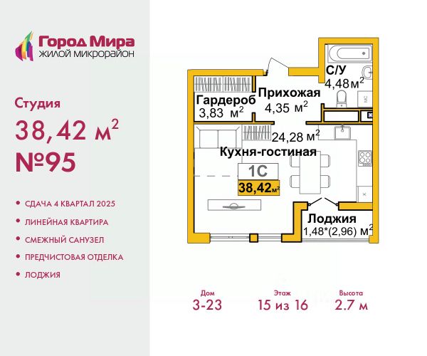 Однокомнатная квартира-студия от застройщика с предчистовой отделкой в ЖМ "Город Мира" на 12 этаже. Общая площадь: 38.42 кв.м., площадь гостиной 24.28 кв.м., из которых 5 кв.м. выделено под кухонную зону. Все окна выходят на одну сторону. В квартире одна лоджия, один совмещенный санузел. Высота потолков 2.7 м. "Город Мира" это масштабный жилой комплекс, созданный для тех, кто ценит комфорт, безопасность и гармонию с природой. Здесь продумана каждая деталь от удобной инфраструктуры до эргономичных планировок квартир. Главные преимущества: Удачное расположение зеленый район с благоприятным микроклиматом Продуманное зонирование жилые кварталы, зоны отдыха и коммерческие объекты Комфорт-класс высокое качество строительства и современные инженерные решения Инфраструктура Города Мира: Образование и досуг: 2 детских сада (по 260 мест каждый) Планируется строительство общеобразовательной школы Детские и спортивные площадки в каждом дворе Беседки для отдыха, зоны для выгула собак Торговля и сервис: Магазины, аптеки, медицинские центры Фитнес-клубы, салоны красоты Детские развивающие центры Парковки: Гостевые парковки Наземные и подземные паркинги Благоустройство территории: Ландшафтный дизайн с зонами отдыха Современные детские площадки Стильные холлы с дизайнерской отделкой Система видеонаблюдения для безопасности. Почему именно 23-й дом? Комфорт и планировки: • Просторные квартиры с двумя санузлами и гардеробными • Увеличенная площадь остекления — максимум света и воздуха • Индивидуальное отопление — комфорт в любое время года Эстетика и стиль: • Дизайнерские входные группы — стиль начинается с порога • Архитектурная подсветка фасада — дом, которым хочется гордиться • Панорамные виды на город и сосновый бор рядом Инфраструктура и удобство: • Консьерж-сервис — дополнительный уровень сервиса и безопасности • Колясочные • Выполнена стяжка пола и штукатурка стен • Центральная локация внутри микрорайона — тишина и доступность Жизнь внутри дома: • Двухэтажный стилобат с коммерцией: магазины, кафе, офисы, студии и даже школа танцев • Современный двор: детский игровой комплекс, зоны отдыха для взрослых, зарядка для электромобилей, зона wi-fi на улице Возможно приобретение в ипотеку по выгодным условиям: • ставка — от 6% годовых • первоначальный взнос — от 20% • срок — до 30 лет • можно использовать материнский капитал даже на первый взнос. Также доступны военная и IT-ипотека Рассрочка от застройщика: • первый взнос от 30%, • равномерные платежи до окончания строительства. Квартира находится в корпусе 3_23. Дом монолитный, одноподъездный, высотой 16 этажей. В подъезде 1 пассажирский и 1 грузовой лифт. Окончание строительства - 4 квартал 2025 года. Оформление сделки по договору долевого участия. #ZM6WZl