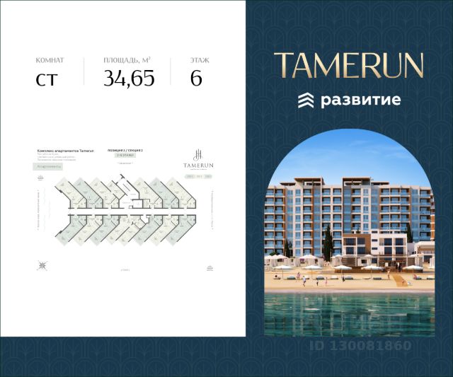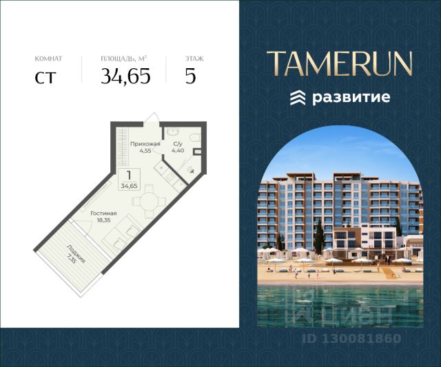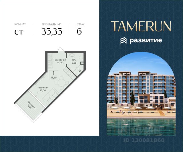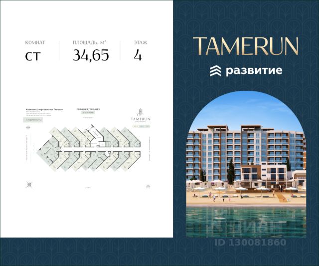 На первой береговой линии Черного моря продается апартамент площадью 35.35 кв. м без отделки. Апартамент находится в апарт-комплексе премиум-класса Tamerun Grand Mirmax 5*, между городами Евпатория и Саки от федерального застройщика ГК "Развитие". Tamerun - дом у моря для тех, кто мечтает о тишине, окружении парков и воды. На приватной территории с собственным пляжем расположены видовые апартаменты, бассейны, спа, рестораны и эстетичные сады. Персонализированный сервис здесь исполняет пожелания, создавая атмосферу пятизвездочного отеля у вас дома. Резиденция сочетает преимущества мягкого климата, близость к городам Саки и Евпатория и доступ к целебным источникам. Это пространство вдали от туристического шума идеально для круглогодичного комфортного проживания и здорового образа жизни. Расположение Пешком: - 3 минуты до приватного пляжа у Черного моря; - 15 минут до Ж/Д станции "Техникум"; - 25 минут до пирса у озера Сасык-Сиваш; На автомобиле: - 5 мин. до Симферопольского шоссе; - 10 мин. до города Саки; - 20 мин. до Евпатории; - 45 мин. до аэропорта имени И. К. Айвазовского; - 60 мин. до Ж/Д вокзала Симферополя. Инфраструктура для детей и взрослых - Эксклюзивный клубный пляж; - Виндсерфинг, дайвинг, катание на лодках и другие виды водного спорта; - Спортивный корт для тенниса, футбола и волейбола; - Приватная парковая территория; - Оздоровительный спа-комплекс; - 2 открытых и 1 закрытый бассейны с морской водой; - Банный комплекс с купелями, хамамом, снежной и соляной комнатами; - Развлекательный центр; - Детский клуб с кинотеатром; - Батуты, лабиринты и скалодромы для подростков; - Конференц-зал на 50 человек и переговорные кабинеты; - Бильярдный клуб; - Фитнес-центр с новейшими тренажерами; - Торговая галерея прямо в доме; - Летнее кафе, 3 ресторана и супермаркет; - Гранд-лобби в главном корпусе; - Просторные входные группы с колясочными и велосипедными; - Подземный паркинг на 188 машино-мест с автомойкой; - Наземная гостевая парковка на 259 машино-мест; - Видеонаблюдение, охрана, вход только по пропускам. Живописный ландшафт - Всесезонный сад: зеленый и цветущий двор круглый год; - Более 100 растений в приватном саду; - Амфитеатр на свежем морском воздухе; - Лаунж-зоны и прогулочные дорожки; - Крупнейшее в Крыму соленое розовое озеро Сасык-Сиваш и Сасыкский заказник; - Песчаные пляжи протяженностью 150 метров; - Главная мечеть Евпатории Джума-Джами, Собор Николая Чудотворца, Комплекс Караимских кенас в непосредственной близости. Проект для инвестиций - Федеральный девелопер, входящий в ТОП-20 застройщиков России; - Профессиональный отельный оператор; - Консьерж-сервис 24/7: бронирование, аренда, клининг, доставка; - Для инвесторов - полное делегирование обслуживания апартаментов; - Пассивный доход от 1,5 млн руб. в год; - Потенциал роста стоимости - 35% в год; - Срок окупаемости при сдаче в аренду - 5-6 лет; - Востребованность весь год (на 70% в среднем заселен комплекс).