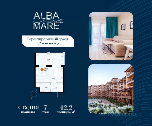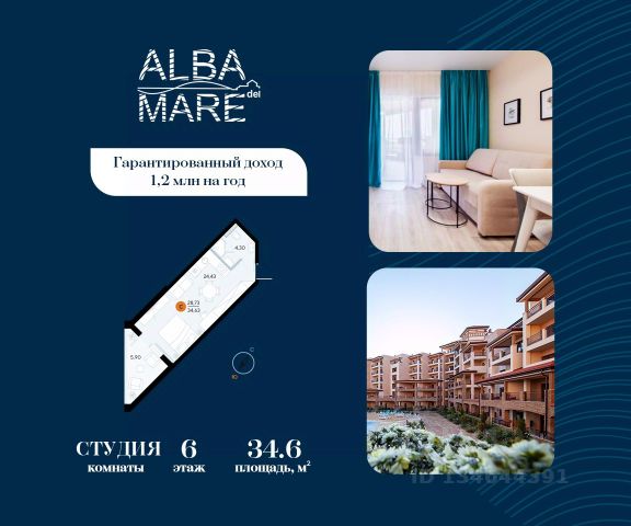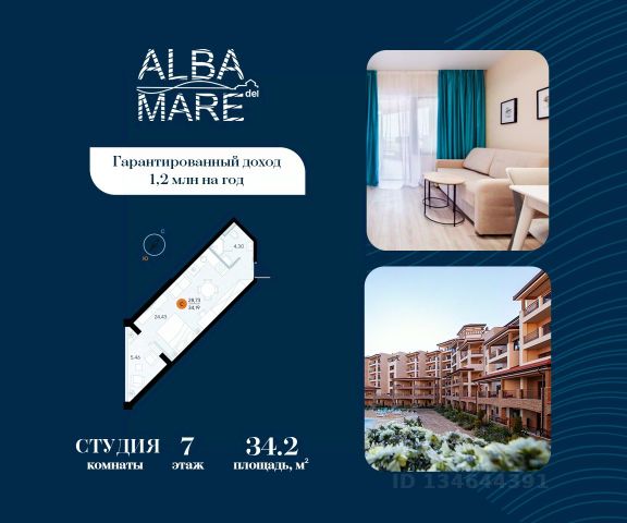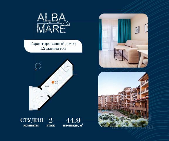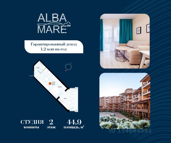 Продаются апартаменты в построенном комплексе. Срок сдачи 4 квартал 2024 года. Альба Дель Маре это комплекс апартаментов бизнес-класса с развитой инфраструктурой. Уютные здания переменной этажности строятся в 5 минутах ходьбы (385 метров) от одного из лучших пляжей Евпатории "Супер Аква Бич". Широкая береговая линия, места для активного отдыха и зоны релакса позволят насладиться отдыхом на любой вкус. Архитектурное решение комплекса создает истинное ощущение Средиземноморья и присутствия на дорогом курорте: скатные черепичные крыши, козырьки и навесы-перголы, арочные завершения проемов, цветовая палитра отделки и фасадов, где используются оттенки желтого, охры, терракоты и бежевого. Переменная этажность здания формирует камерность проекта, создавая прекрасные видовые характеристики для каждого апартамента. Просторные террасы с видом на море, патио с собственным выходом к бассейну на первых этажах комплекса, детская и спортивная площадки, ландшафтный дизайн здесь все создано для роскошного отдыха и расслабления. Территория комплекса апартаментов закрыта и находится под круглосуточным видеонаблюдением, что позволит резидентам и гостям чувствовать безопасность проживания. Концепция комплекса: комфорт проживания с первых дней заселения. Реализация апартаментов осуществляется с полной отделкой под ключ. Собственники апартаментов имеют возможность поручить управление недвижимостью профессиональному оператору, что позволит получать стабильный доход. Автономная газовая котельная позволит не зависеть от внешних отключений отопления., парковочные места на закрытой территории комплекса обеспечат безопасность вашему автомобилю, система центрального кондиционирования создаст комфортную температуру в каждом номере. Жилой комплекс реализуется в соответствии с 214 ФЗ.