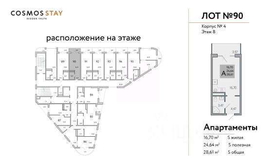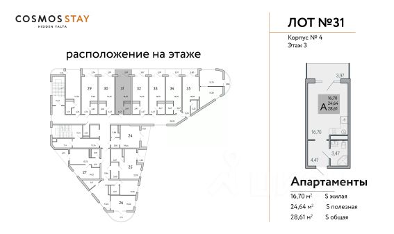 ГОТОВЫЙ БИЗНЕС ПОД КЛЮЧ ДОХОД ОТ 1 500 000 руб. с первого года деятельности отеля. Продаются апартаменты от Застройщика в строящемся комплексе COSMOS STAY HIDDEN YALTA, под управлением ведущего отельера в России COSMOS HOTEL GROUP (COSMOS HOTEL GROUP это Аккредитованная Управляющая компания международных гостиничных операторов). ИНВЕСТИЦИОННЫЕ ПРЕИМУЩЕСТВА КОМПЛЕКСА: - Первый COSMOS STAY в Ялте- Гостиничный номер с ремонтом, мебелью и техникой - Управление номерным фондом командой COSMOS- Прозрачность управления - Гарантированная круглогодичная загрузка комплекса - Глубокое знание и владение бизнесом - БИЗНЕС-МОДЕЛЬ Будущего: круглогодичный и пассивный доход - Среднегодовая доходность 22 % О КОМПЛЕКСЕ COSMOS STAY HIDDEN YALTA это комплекс апартаментов из 5 корпусов для отдыха с собственной развитой инфраструктурой. Находится в Ялте у подножья горы Могаби на южном берегу Крыма, вблизи с живописным горнолесным заповедником, у подножья горы Ай-Петри. Из апартаментов комплекса открываются завораживающие виды на горные вершины и Черное море. ЭТАЖНОСТЬ КОРПУСОВ: до 9 этажей Срок сдачи объекта: IV-кв. 2026г. Квадратура апартаментов: от 25м2 до 80,4 м2. Апартаменты с отделкой и мебелью. ИНФРАСТРУКТУРА КОМПЛЕКСА - Лаунж-зоны - Спа-центр - Детские пространства и площадки для спорта - Всесезонный бассейн - Пространства для медитаций и занятий йогой - Ресторан и Лобби - Супермаркеты и аптека - Консьерж-сервис полного цикла обслуживания с управлением - Экотропы для прогулок - Канатная дорога в 20 минутах КОНЦЕПЦИЯ АПАРТ-КОМПЛЕКСА Предлагает уникальный формат отдыха в стиле Retreat. Здесь созданы идеальные условия комфортного отдыха, заботы о вашем ментальном и физическом здоровье, вдали от городской суеты, в окружении векового леса и природы. Здесь вы найдете всё необходимое для восстановления и перезагрузки. Рассрочка от застройщика, подробности уточняйте в Отделе продаж. Строительство ведется при проектном финансировании СБЕРБАНКА, согласно ФЗ-214. Продажа через эскроу-счета без комиссий и переплат.