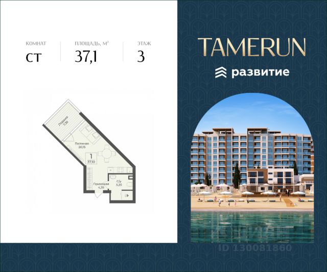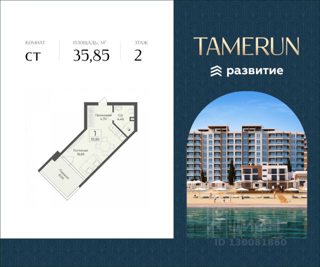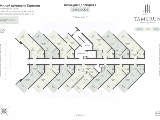 "Tamerun" - морская резиденция на Западном берегу Крыма, между городами Евпатория и Саки. Резиденция "Tamerun" представляет собой современный комплекс из четырёх корпусов высотой 9 и 12 этажей, гармонично вписанных в живописный ландшафт. Интерьеры выполнены в изысканном элегантном стиле с применением премиальных материалов — натурального мрамора, ценных пород дерева и высококачественной кожи. Просторные помещения наполнены естественным светом благодаря большим панорамным окнам, открывающим завораживающие виды на Черное море. Атмосфера резиденции пропитана уютом и гармонией, создавая идеальные условия для комфортной жизни и отдыха. Рядом с "Tamerun" находится Сасыкский заказник и самое крупное в Крыму солёное розовое озеро Сасык-Сиваш. На территории резиденции находится открытый бассейн с подогревом, окружённый шезлонгами и зоной отдыха, где можно наслаждаться теплыми лучами солнца и свежим морским бризом. Для любителей активного отдыха предусмотрен теннисный корт и фитнес-зал, оборудованный новейшими тренажёрами. В солнечной резиденции есть всё для жизни и интересного отдыха: собственный песчаный пляж и теннисный корт, бассейны с морской водой, рестораны и летнее кафе, зона СПА и фитнес-центр, общественно-деловые пространства и подземный паркинг. Профессиональная сервисная компания с международным опытом возьмёт на себя все операционные вопросы по управлению и эксплуатации, обеспечивая 5-звёздочный уровень обслуживания.