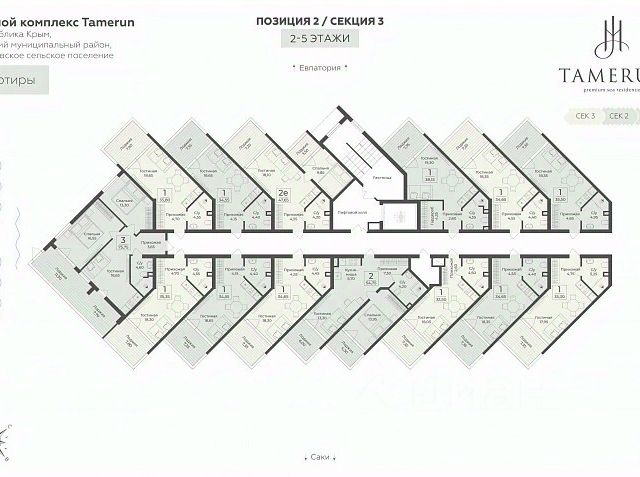 Предлагаю вашему вниманию апартамент в 5* отеле Tamerun Grand Mirmax, который находится на первой береговой линии западного побережья Крыма между городами Евпатория и Саки. Апартамент, площадью 34.6 кв.м. расположен на первом этаже девятиэтажного корпуса.