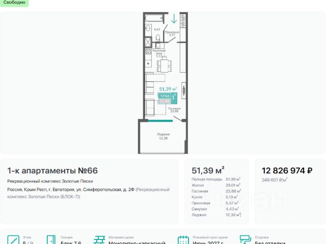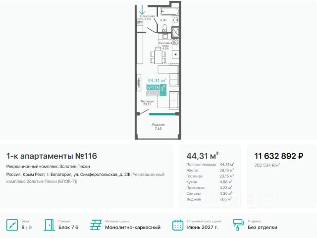 Работаем с любовью Без комиссии для покупателя) Рассрочка Золотые пески Блок 7 ПВ - 30% , остаток делится на равные ежемесячные платежи до 1.03.2027 года. Вид из окон Море Комплекс апартаментов "Золотые пески" в г. Евпатория — семейный комплекс апартаментов на берегу моря с собственной инфраструктурой, в новом современном районе курортного города. Панорамный вид на море из окон апартаментов, шум прибоя, мягкий климат и масса развлечений обеспечат роскошный отдых на крымском побережье. БЛАГОУСТРОЙСТВО и ИНФРАСТРУКТУРА Богатое озеленение: деревья, кустарники, газоны, фонтаны и современные малые архитектурные формы. Наземная парковка на 150 мест по периметру комплекса. На территории комплекса создана полная внутренняя инфраструктура: кафе, пляжные бары, оборудованный пляж, продуктовые магазины, кондитерская, банный комплекс, зоны водных аттракционов и много другое создает комфортную среду для отдыха и восстановления. Жилой комплекс "Золотые пески" в Евпатории, Крым, предлагает уникальные квартиры, которые обладают потрясающим панорамным видом на море. Расположенный в непосредственной близости от пляжа, данный комплекс обеспечивает комфортное проживание, отдых и возможность заработка. Квартиры в "Золотых песках" предлагаются с отделкой под ключ, что позволяет новым владельцам сразу же заселиться и наслаждаться прекрасными видами на море. Кроме того, комплекс предоставляет услуги по управлению, что обеспечивает надежность и безопасность для владельцев квартир. Жилой комплекс "Золотые пески" идеально подходит для тех, кто хочет насладиться прекрасным видом на море, комфортом проживания и возможностью заработка. Благодаря своему расположению в шаговой доступности от пляжа, данный комплекс предлагает уникальную возможность наслаждаться морскими прогулками и отдыхом на пляже. Отличная инфраструктура и возможность аренды квартир делают данный комплекс привлекательным как для собственного проживания, так и для инвестиций. СЕРВИС Комплекс апартаментов обслуживают специалисты собственной управляющей компании. Все Ваши заботы переходят в руки профессионалов. А если Вы планируете сдавать апартаменты в аренду, УК возьмёт на себя все организационные вопросы. ПРЕИМУЩЕСТВА - бирюзовое море в 50 м от дома; - закрытый дом с видеонаблюдением; - вид на розовое озеро и море; - консьерж-сервис; - автономная газовая котельная; - просторные лоджии до 12,8 м²; - собственная управляющая компания; - доверительное управление апартаментами 24/7; Один из преимуществ жилого комплекса - наличие парковки и развитой инфраструктуры. Владельцы квартир могут не беспокоиться о поиске места для своего автомобиля и наслаждаться комфортной парковкой. Кроме того, рядом с комплексом имеется все необходимое для комфортного проживания и отдыха: магазины, рестораны, кафе и другие объекты инфраструктуры. Жилой комплекс "Золотые пески" располагается на черноморском побережье в 100 метрах от моря. Местный климат достаточно мягкий, он идеально подходит для людей любого возраста. Бл
