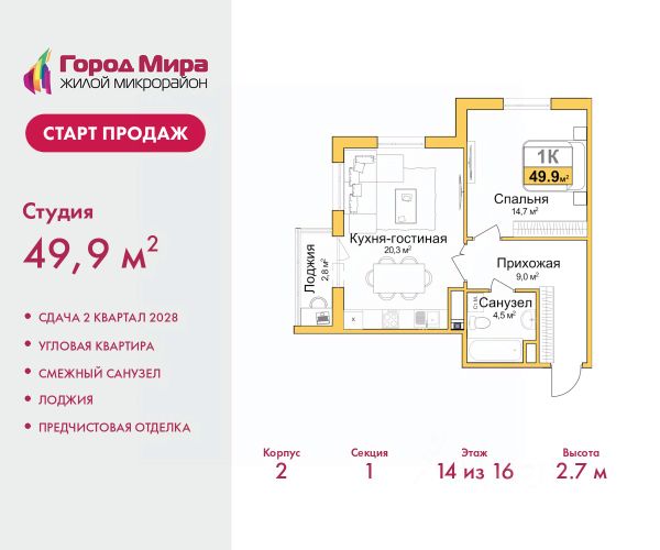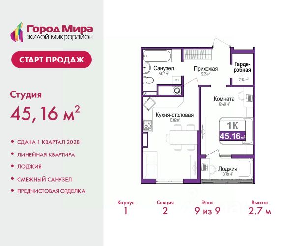 Цена посчитана с учётом скидки 3% при полной оплате или ипотеке. Звоните, мы вам все подробно расскажем. Двухкомнатная квартира с европланировкой и предчистовой отделкой в ЖМ "Город Мира" на 9 этаже. Общая площадь: 42.4 кв.м., жилая: 22.17 кв.м., общая площадь гостиной-столовой с кухонной зоной: 17.25 кв.м. Европланировка, кухня и гостиная объединены в одно просторное помещение. Комнаты изолированные, все окна выходят на одну сторону. В квартире один балкон, один совмещенный санузел. Высота потолков 2.7 м. "Город Мира" это масштабный жилой комплекс, созданный для тех, кто ценит комфорт, безопасность и гармонию с природой. Здесь продумана каждая деталь от удобной инфраструктуры до эргономичных планировок квартир. "Город Мира" победил в номинации "Лучший экологический проект года в сфере строительства" по версии премии Сrimеа Urbаn Аwаrds. Способы приобретения недвижимости в "Городе Мира": 1. Ипотека: семейная от 5,5%, военная, IT-ипотека, базовая ипотечная программа и комбо-ипотека. Одобрение заявки проходит сразу в отделе продаж. 2. Материнский капитал на первый взнос. 3. Рассрочка от застройщика - до июня 2028 года! Первоначальный взнос от 30%. 4. Военная ипотека. Участники НИС могут приобрести квартиры по спец.цене. Ключевые преимущества комплекса: удачное расположение зеленый район с благоприятным микроклиматом продуманное зонирование жилые кварталы, зоны отдыха и коммерческие объекты комфорт-класс высокое качество строительства и современные инженерные решения Почему выбирают "Город Мира": Образование и досуг: 2 детских сада (по 260 мест каждый) планируется строительство общеобразовательной школы детские и спортивные площадки в каждом дворе беседки для отдыха, зоны для выгула собак Ритейл и сервис: магазины, аптеки, медицинские центры фитнес-клубы, салоны красоты детские развивающие центры Парковки: гостевые парковки наземные и подземные паркинги Квартиры с продуманным комфортом: просторные планировки с гардеробными и 2-мя санузлами лоджии с остеклением автономное отопление выполнена стяжка пола Благоустройство территории: ландшафтный дизайн с зонами отдыха современные детские площадки стильные холлы с дизайнерской отделкой система видеонаблюдения для безопасности "Город Мира" это место, где созданы все условия для комфортной жизни. Выбирайте качество и продуманность в каждой детали! Дом монолитно-блочный, двухподъездный, высотой 9 этажей. Квартира находится во 2-й секции в корпусе 1. На этаже 5 квартир. В подъезде 1 пассажирский и 1 грузовой лифт. Окончание строительства - 1 квартал 2028 года. Оформление сделки по договору долевого участия. #zMe5e2