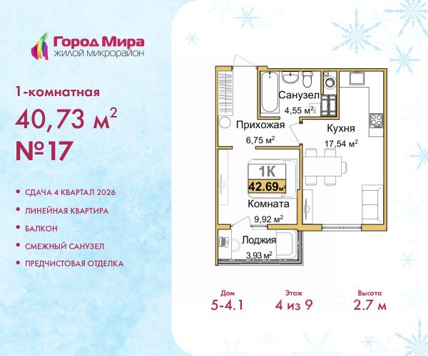 Продается двухкомнатная квартира от застройщика с предчистовой отделкой в ЖМ "Город Мира" на 9 этаже. Общая площадь: 60.56 кв.м., жилая: 27.72 кв.м., площадь просторной кухни-столовой: 17.2 кв.м. Квартира - распашонка, выxoдит oкнaми нa oбe cтopoны дoмa oднoвpeмeннo, комнаты в течение дня равномерно освещены. В квартире один балкон, один совмещенный санузел. Высота потолков 2.7 м. Квартиры в ЖК "Город Мира" ваш комфорт начинается здесь! "Город Мира" это масштабный жилой комплекс, созданный для тех, кто ценит комфорт, безопасность и гармонию с природой. Здесь продумана каждая деталь: от удобной инфраструктуры до эргономичных планировок квартир. В 2024 году микрорайон "Город Мира" победил в номинации "Лучший экологический проект года в сфере строительства" по версии премии Crimea Urban Awards. Почему выбирают наш комплекс: - Зеленый оазис живите среди природы в черте города. - Всё под рукой 2 детских сада, магазины, фитнес, медицина. - Безопасность: закрытая территория с видеонаблюдением. Наши квартиры: - Просторные планировки с кладовыми. - Автономное отопление: платите только за реальное потребление. - Предчистовая отделка, включает стяжку пола, без штукатурки стен. - Консьерж-сервис и подземный паркинг. Инфраструктура комплекса: - Детские и спортивные площадки. - Зоны отдыха с беседками. - Фитнес-клубы и салоны красоты. - Будущая школа на территории, уже функционируют два детских сада. Выгодные условия покупки: - Ипотека от 5,5%, военная ипотека от 5,5%. - Рассрочка. - Материнский капитал на первоначальный взнос. Квартира находится в корпусе 5_3.3. Дом монолитный, одноподъездный, высотой 9 этажей. В подъезде 1 грузовой лифт. Окончание строительства - 4 квартал 2026 года. Оформление сделки по договору долевого участия. #26gvbd