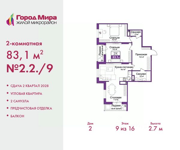 Спешите оформить бронирование, пока действует скидка, срок предложения ограничен! Стоимость квартиры указана со скидкой, ваша экономия составит 386,850 руб. Информация по телефону, наши менеджеры вам все расскажут. 2-комн. квартира с предчистовой отделкой в ЖМ "Город Мира" на 9 этаже. Общая площадь: 83.1 кв.м., жилая: 29.4 кв.м., площадь просторной кухни-столовой: 28.3 кв.м. Угловая квартира, окна oбecпeчивaют paвнoмepнoe ocвeщeниe в тeчeниe дня. В квартире один балкон, один совмещенный и один раздельный санузел. Высота потолков 2.7 м. "Город Мира" это масштабный жилой комплекс, созданный для тех, кто ценит комфорт, безопасность и гармонию с природой. Здесь продумана каждая деталь от удобной инфраструктуры до эргономичных планировок квартир. "Город Мира" победил в номинации "Лучший экологический проект года в сфере строительства" по версии премии Сrimеа Urbаn Аwаrds. Способы приобретения недвижимости в "Городе Мира": 1. Ипотека: семейная от 5,5%, военная, IT-ипотека, базовая ипотечная программа и комбо-ипотека. Одобрение заявки проходит сразу в отделе продаж. 2. Материнский капитал на первый взнос. 3. Рассрочка от застройщика - до июня 2028 года! Первоначальный взнос от 30%. 4. Военная ипотека. Участники НИС могут приобрести квартиры по спец.цене. Ключевые преимущества комплекса: удачное расположение зеленый район с благоприятным микроклиматом продуманное зонирование жилые кварталы, зоны отдыха и коммерческие объекты комфорт-класс высокое качество строительства и современные инженерные решения Почему дом повышенной комфортности 2 в "Городе Мира" это лучшее решение? Образование и досуг: 2 детских сада (по 260 мест каждый) планируется строительство общеобразовательной школы детские и спортивные площадки в каждом дворе беседки для отдыха, зоны для выгула собак Ритейл и сервис: магазины, аптеки, медицинские центры фитнес-клубы, салоны красоты детские развивающие центры Парковки: гостевые парковки наземные и подземные паркинги Квартиры с продуманным комфортом: просторные планировки с кладовыми и колясочными лоджии с остеклением лапомойки для питомцев на первых этажах домов индивидуальное отопление выполнена стяжка пола и штукатурка стен консьерж-сервис для дополнительного удобства Благоустройство территории: ландшафтный дизайн с зонами отдыха современные детские площадки стильные холлы с дизайнерской отделкой система видеонаблюдения для безопасности "Город Мира" это место, где созданы все условия для комфортной жизни. Выбирайте качество и продуманность в каждой детали! Квартира находится во доме повышенной комфортности 2, 4-я очередь. Дом монолитно-каркасный, одноподъездный, высотой 16 этажей. В подъезде 1 пассажирский и 1 грузовой лифт. Окончание строительства - 2 квартал 2028 года. Оформление сделки по договору долевого участия. Квартира находится в корпусе 2. Дом монолитный, одноподъездный, высотой 16 этажей. На этаже 7 квартир. В подъезде 1 пассажирский и 1 грузовой лифт. Оконча Квартира по военной ипотеке в Симферополе.