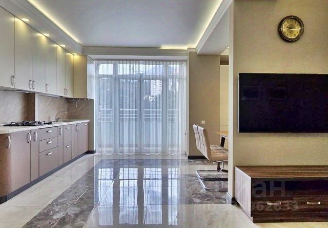 В гостиной ламинат, на кухне встроенная мебель и техника. Стены - декоративная штукатурка. Прихожая, кухня, балконы - микроцемент с системой электрических теплых полов.