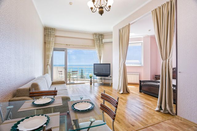 Квартира располагает холлом, гостиной, кухней-столовой, санузлом, кабинетом с видом на море, спальней, комнатой отдыха (можно оборудовать под вторую спальню) с видом на море и гардеробной. Вся необходимая бытовая техника, включая посудомоечную машину, также есть в наличии. Отопление в квартире осуществляется газовым котлом, что обеспечивает комфортный уровень тепла.