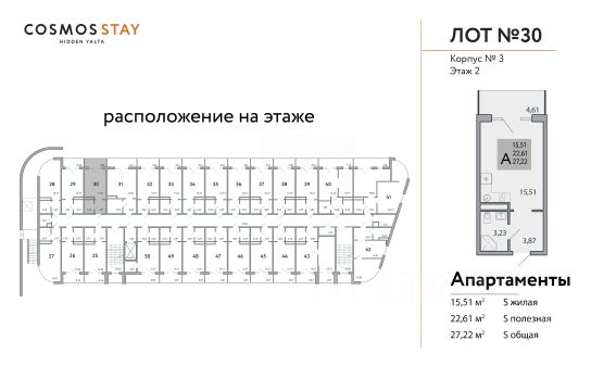 COSMOS STAY HIDDEN YALTA - это комплекс апартаментов из 5 корпусов для отдыха с собственной развитой инфраструктурой. Находится в Ялте у подножья горы Могаби на южном берегу Крыма, вблизи с живописным горно-лесным заповедником. Из апартаментов комплекса открываются завораживающие виды на горные вершины и Чёрное море. В шаговой доступности могабинские озера. Находится на подножии Ай-Петри, что позволяет комфортно добраться до горных склонов. До центра Ялты 10 минут на машине, как и до моря. Концепция апарт-комплекса предполагает круглогодичный комфортный отдых в формате retreat, с заботой о ментальном и физическом здоровье. Всё для Вашего восстановления и перезагрузки, для размеренной и комфортной жизни. Целебный морской воздух и благодатный климат. В комплексе создана атмосфера респектабельной среды для жизни: - собственная инфраструктура; - свой зеленый двор; - безопасность; - детские пространства; - собственная инфраструктура; - свой зеленый двор; - безопасность; - детские пространства; - лаунж-зоны; - будет присвоен статус 3 звезды и работать отельный оператор; - пространства для медитаций и занятий йогой; - ресторан; - индивидуальные келлеры для габаритного инвентаря; - всесезонный бассейн; Консьерж-сервис полного цикла обслуживания с опцией управления недвижимостью - разрешит любой возникающий вопрос. Строительство ведется при проектном финансировании СБЕРБАНКА, ФЗ-214. Продажа через эскроу-счет без комиссий. Завершение строительства - 3 квартал 2026 года Передача ключей до 31.12.2026 Ремонт и оснащение апартаментов: декабрь 2026-апрель 2027 Запуск апарт-отеля в управление - июнь 2027