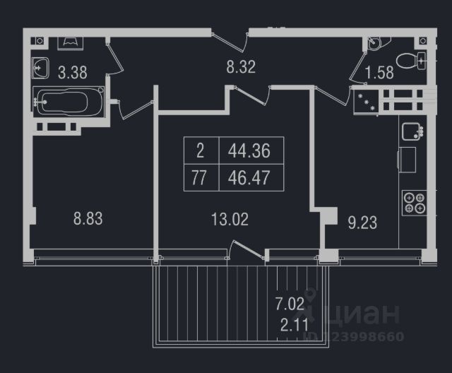 Сам апартамент включает в себя изолированную спальню с балконом, площадью 14 кв. м., наблюдать закаты и рассветы прям из своей спальни, не это ли сказка? Кухня-гостиная 18кв. м., Санузел и просторная прихожая, в которой можно выделить место под гардеробную.