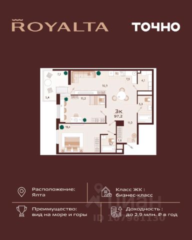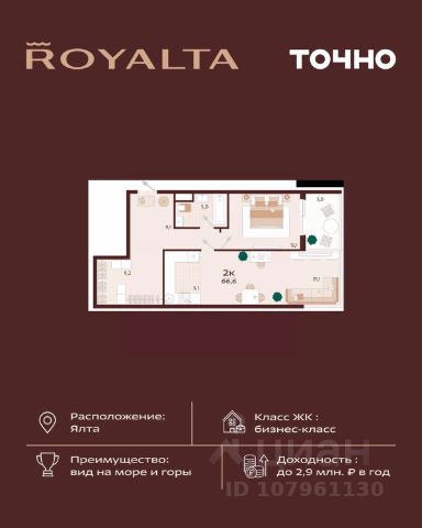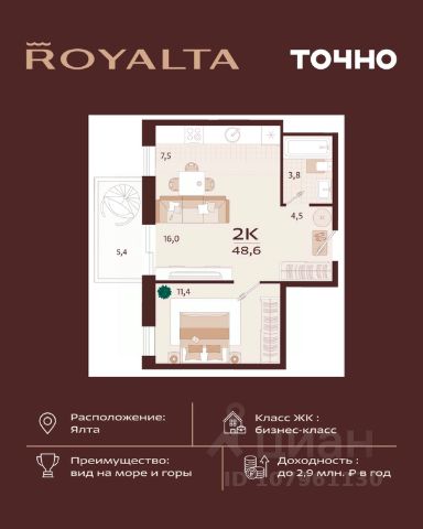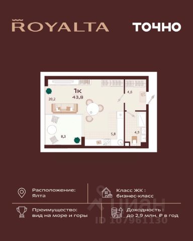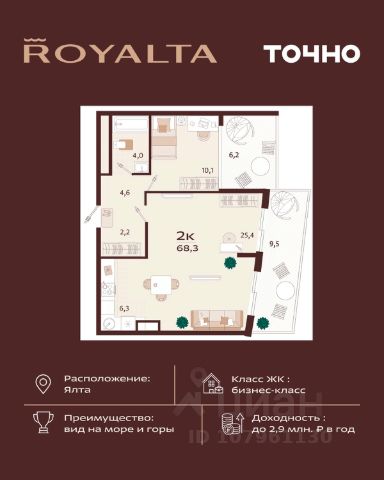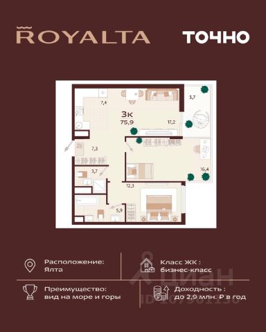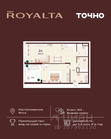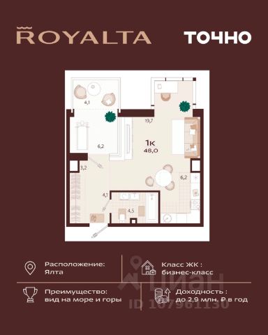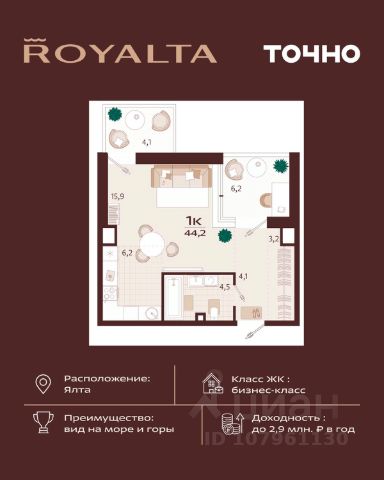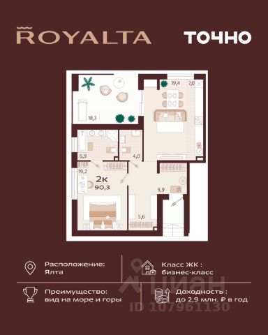 Жилой комплекс "РОЯЛТА" включает 5 монолитно-кирпичных девятиэтажных зданий. Проект предлагает квартиры различных планировок: от однокомнатных до трехкомнатных с расширенными балконами и террасами до 13,4 м2. Территория будет благоустроена детскими игровыми и спортивными площадками, гостевой автостоянкой и озеленением, включая газоны, деревья и кустарники. Также появятся современные уличные тренажёры, СПА-комплекс и панорамный инфинити-бассейн. В шаговой доступности находятся центральная набережная Ялты, детские сады, школы, супермаркеты, торговые центры, Ялтинский медицинский колледж, автовокзал и Мордвиновский парк.