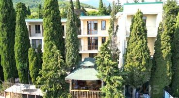 Трёхэтажная гостиница на 25 номеров площадью 750 м² расположена в уникальном экологически благоприятном районе Ялты вблизи заповедного хвойного леса.