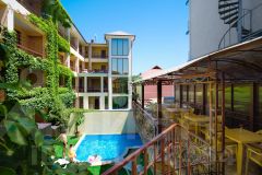 Трёхэтажная гостиница на 25 номеров площадью 750 м² расположена в уникальном экологически благоприятном районе Ялты вблизи заповедного хвойного леса.