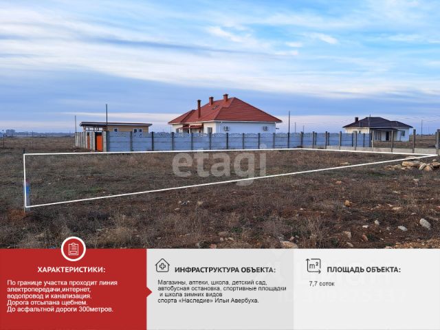 Продается земельный участок 7,7 соток, село Уютное ,ул. Токарева, Сакского района. Категория земель: Земли населенных пунктов. Разрешённое использование: Для индивидуального жилищного строительства. Участок ровный, правильной формы без уклона. По границе участка проходит линия электропередачи, интернет, водопровод и канализация. Дорога отсыпана щебнем. До асфальтной дороги 300метров Право собственности РФ, проведено межевание. Оформление через МФЦ (договор купли-продажи). В населенном пункте развита инфраструктура: магазины, аптеки, школа, детский сад, автобусная остановка, спортивные площадки и школа зимних видов спорта "Наследие" Ильи Авербуха. Звоните, отвечу на интересующие вопросы МЫ ГАРАНТИРУЕМ ФИНАНСОВУЮ БЕЗОПАСНОСТЬ ДЛЯ НАШИХ КЛИЕНТОВ. Полное юридическое сопровождение сделки. Высокий шанс одобрения ипотеки. Звоните, с удовольствием ответим на ваши вопросы! Код пользователя: 172459 Номер в базе: 3342679