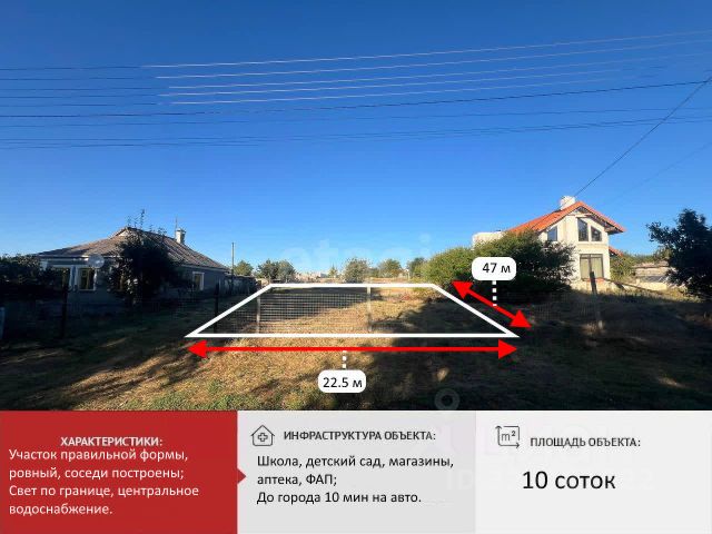 Арт. 91368676. Участок ИЖС с панорамными видами рядом с Симферополем! Просторный ровный участок площадью 10 соток предназначен для индивидуального жилищного строительства. Находится в уютном и живописном населенном пункте Донское в 5 км от Симферополя. Центр жилой улицы. Вокруг проживают соседи. По границе участка проходит электричество и центральный водопровод. Газификация этого населенного пункта запланирована на 2026 год. Участок находится на возвышенности (неподтапливаемое место, и это важно!). Через дорогу проходит речка, за которой расположен хвойный лес. И всю эту красоту прекрасно видно с предлагаемого участка. В шаговой доступности расположены магазины, ПВЗ, остановки общественного транспорта. Недалеко — школа, новый детский сад, дом культуры, почта, амбулатория, аптека. В Донское регулярно, через каждые 20 минут, ходят маршрутные автобусы. В 2-х км от населенного пункта проходит трасса "Таврида", по которой быстро и с комфортом можно добраться в любую точку Крыма, в том числе за 30 минут до лучших пляжей ЮБК (Алушта). Этот участок идеально подойдет для тех, кто хочет жить: \\\\\\\\ в населенном пункте с развитой инфраструктурой неподалеку от города; рядом с речкой, лесом и любоваться их красотами из окон/террасы своего дома; в экологически чистом районе; в Крыму и иметь возможность в течение получаса доехать до морского побережья. А также этот объект недвижимости будет интересен инвесторам — цена на землю в Крыму неуклонно растет, и ее не становится больше! Документы в порядке. Один собственник. Обременений нет. Профессиональное сопровождение сделки! Помощь в одобрении ипотеки! Звоните! С удовольствием ответим на интересующие Вас вопросы и оперативно проведем показ!