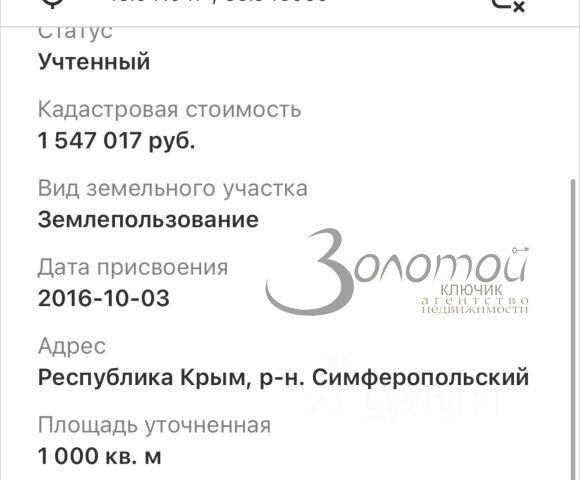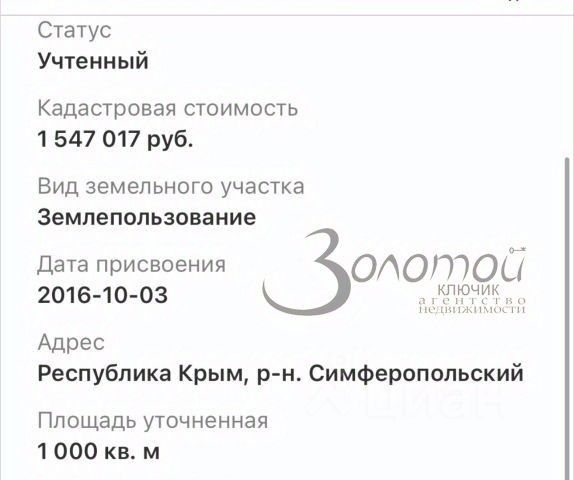 В продаже Земельный участок 10 сот прямоугольной формы Идеальное месторасположение Вдоль участка проходят коммуникации Газ,свет,вода Удобная транспортная развязка До моря 30 мин Кад номер: 90:12:000000:2017 Звоните прямо сейчас и мы найдем точки соприкосновения!