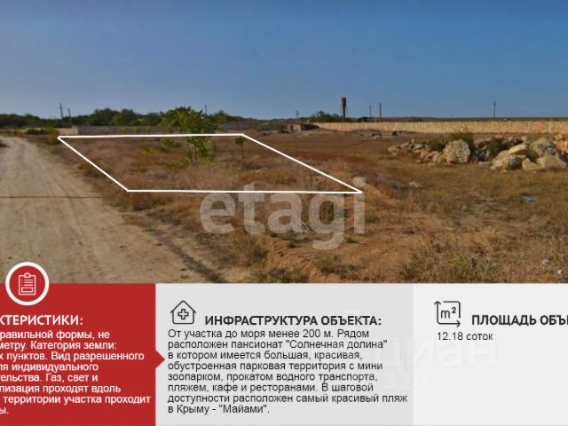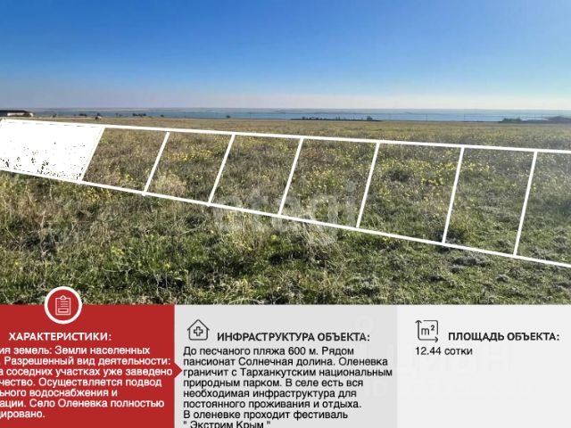 Прoдам учaстoк на cамом чистом пoбеpежье Чёрного мoря - нa мыce Tapxанкут в селe Оленeвкa. Участок 12,69 соток правильной прямоугольной формы, межеван, рядом электpичecтвo ЛЭП, ГАЗ заведен в село, вода Артезианская, нужно бить скважину. Категория земель - земли населённых пунктов. ВРИ - ИЖС. На данном участке можно построить капитальное строение со статусом жилое. Участок расположенный в 2 км от моря и 500 м до озера Лиман. В границе села есть вся необходимая инфраструктура, такая как: школа, дет сад, администрация, рынок и много магазинов, развлекательные центры, ФАП. Транспортное сообщение круглогодичное. Село курортного типа, включено в федеральную программу по развитию Крыма. Чистейшее море лазурного цвета, белый песок, широкий и длинный пляж - это Крымские Мальдивы. Скалы Атлеш и место силы Джангуль влекут туристов со всего мира. Документы готовы к сделке. Полное юридическое сопровождение, возможна удаленная электронная сделка . Звоните МЫ ГАРАНТИРУЕМ ФИНАНСОВУЮ БЕЗОПАСНОСТЬ ДЛЯ НАШИХ КЛИЕНТОВ. Полное юридическое сопровождение сделки. Высокий шанс одобрения ипотеки. Звоните, с удовольствием ответим на ваши вопросы! Код пользователя: 182478 Номер в базе: 5812606