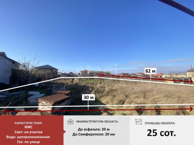 Прекрасные видовые участки, расположенные по адресу: Симферополь, ул. Генерала Абрамова - раскрывается вид на Симферопольское водохранилище и горный Крым, с северной стороны прикрыты горным массивом. Имеются технические возможности для подключения: газ, вода, электричество. Удобная транспортная инфраструктура: транспорт - маршрутное такси в 70-ти метрах. Рядом школа, д/сад в Марьино. Имеется одиннадцать смежных участков, при желании, возможно рассмотреть продажу более одного. Данные земли включены в границы города Симферополя. Газ - вдоль улицы, электричество - установлено новое КТП в начале массива. Возможен торг, рассмотрю варианты обмена.