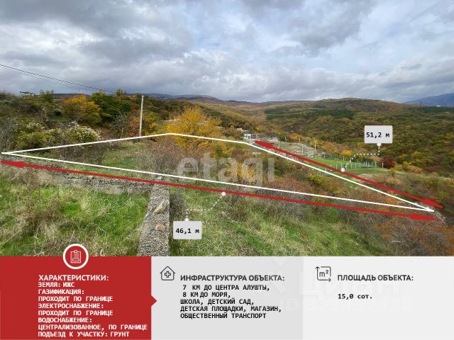 Продажа земельного участка площадью 15 соток в селе Лучистое, г. Алушта! Участок расположен в лучшей части села, без грунтовых дорог, что дает преимущество для красивых панорамных видов на море, горы и город. Вид разрешенного использования: индивидуальное жилищное строительство. Правильная конфигурация, рельеф участка полностью ровный. Подъездная дорога асфальтированная. Расстояние до города и моря 10 км. Коммуникации по границе участка . В поселке есть школа, детский сад, магазины и амбулатория, регулярно ходит общественный транспорт. Отлично подойдёт для строительства жилого дома в тихом месте с прекрасным видом. Звоните, покажем участок в удобное для Вас время! Покупка без комиссии!