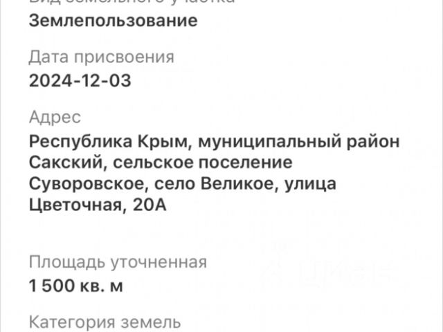 Продается участок 15 соток в живописном селе Великое, всего в 10 км от курортного города Евпатории. Участок ровный, что идеально подходит для строительства вашего дома мечты. Поселок газифицирован, активно застраивается. Категория земель: земли населенных пунктов. Вид разрешённого использования: для индивидуального жилищного строительства (ИЖС). Это идеальное место для строительства вашего загородного дома или коттеджа! Здесь вы найдете все, что необходимо для комфортной жизни: рядом магазины, школа, детский сад, амбулатория. Удобное транспортное сообщение обеспечит вам легкий доступ к городу и другим объектам. Село Великое становится все более привлекательным для жизни и инвестиций благодаря строительству автомобильной магистрали федерального значения Симферополь - Мирный. Все документы в порядке, вы можете быть уверены в безопасности сделки. Не упустите возможность стать счастливым обладателем этого участка! Звоните прямо сейчас, чтобы узнать больше и записаться на просмотр. МЫ ГАРАНТИРУЕМ ФИНАНСОВУЮ БЕЗОПАСНОСТЬ ДЛЯ НАШИХ КЛИЕНТОВ. Полное юридическое сопровождение сделки. Высокий шанс одобрения ипотеки. Звоните, с удовольствием ответим на ваши вопросы! Код пользователя: 191422 Номер в базе: 10304154