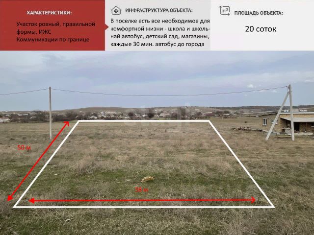 Земля мечты в развивающемся районе готова принять своих хозяев! Земельный участок - 20 соток (ИЖС), в перспективе расцветающего села Урожайное ожидает будущих владельцев. Представьте, как приятно просыпаться каждое утро под звуки природы, дышать свежим воздухом! Инженерные коммуникации уже проведены к границам участка: свет, газ, вода — всё готово для подключения и быстрого старта строительства. Никаких проблем с началом стройки и дальнейшей эксплуатацией. Посёлок располагает прекрасной инфраструктурой: действующая школа, детский сад, храмы, поликлиника, аптеки, супермаркеты, филиалы известных магазинов Wildberries и Ozon, автосервисы, спортплощадки — здесь комфортно жить семьям с детьми и пожилым людям. До ближайшего города автобусы отправляются каждые 20 минут, дорога быстрая и простая, благодаря удобным выездам на Московское шоссе и трассу Таврида. Не упустите шанс приобрести идеальный участок для жизни и отдыха всего лишь в паре шагов от будущего дома Вашей мечты! Звоните прямо сейчас и убедитесь сами насколько близко Ваше новое счастье! Номер объекта:9878116 МЫ ГАРАНТИРУЕМ ФИНАНСОВУЮ БЕЗОПАСНОСТЬ ДЛЯ НАШИХ КЛИЕНТОВ. Полное юридическое сопровождение сделки. Высокий шанс одобрения ипотеки. Звоните, с удовольствием ответим на ваши вопросы! Код пользователя: 126636 Номер в базе: 9878116