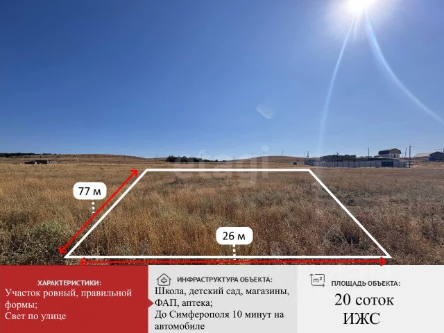 ОТ СОБСТВЕННИКА! Продам земельный участок 20 соток (ИЖС). В перспективном, развивающемся месте с. Урожайное. Инфраструктура с. Урожайное хорошо развита - действующая школа и детский сад, церковь,мечеть,разно профильные магазины,аптека,амбулатория,банкоматы, вайлдберриз, озон, футбольное поле, волейбольная площадка, СТО, мойка и. т. д. Автобусы до города ходят каждые 20 минут. Выезд на Московское шоссе и трассу.Таврида. Район актино развивается, соседи проживают круглый год. Участок в тихом и спокойном месте, где вы будете наслаждаться чистым воздухом и прекрасными панорамами. В пешей доступности остановка общественного транспорта. Рядом озеро для отдыха и рыбалки. Кадастровый номер: 90:12:190103:2887 Участок правильной прямоугольной формы. Можно разделить на 2, или 3 участка. Свет, газ, вода по границе участка.