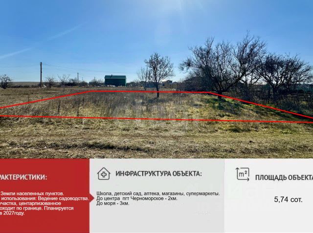 В продаже земельный участок 25 соток в активно развивающемся селе Снежное, Межводненского сельского поселения. Черноморского района Республика Крым. К селу подходит асфальтированная дорога, из села открывается очень красивый вид на море и Панское озеро, дорожная развязка хорошая, доступно все , что нужно для жизни. Село полностью газифицировано, на участке свет, вода, рядом колодец с чистейшей водой. Участок выходит с одной стороны на главную улицу, с другой на трассу, очень удобный подъезд. Участок большой, при необходимости можно поделить. Звоните. пишите, по всем вопросам дам консультацию! МЫ ГАРАНТИРУЕМ ФИНАНСОВУЮ БЕЗОПАСНОСТЬ ДЛЯ НАШИХ КЛИЕНТОВ. Полное юридическое сопровождение сделки. Высокий шанс одобрения ипотеки. Звоните, с удовольствием ответим на ваши вопросы! Код пользователя: 181144 Номер в базе: 3403557